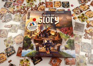 Tales of Glory (2018) Spielidee: Romain ChastanIllustrationen: Miguel CoimbraVerlag: Ankama / Board Game BoxAnzahl der Spielenden: 2–5 PersonenAltersempfehlung Verlag: ab 10 JahrenSpieldauer: ca. 30–45 Minuten Generationentauglichkeit: Eher nicht, das Material ist teils schon sehr klein, fitzelig und Symbole nicht so einfach zu erkennen. - Gesunder Kartenspaß – Punktesalat von Pegasus (Rezension)