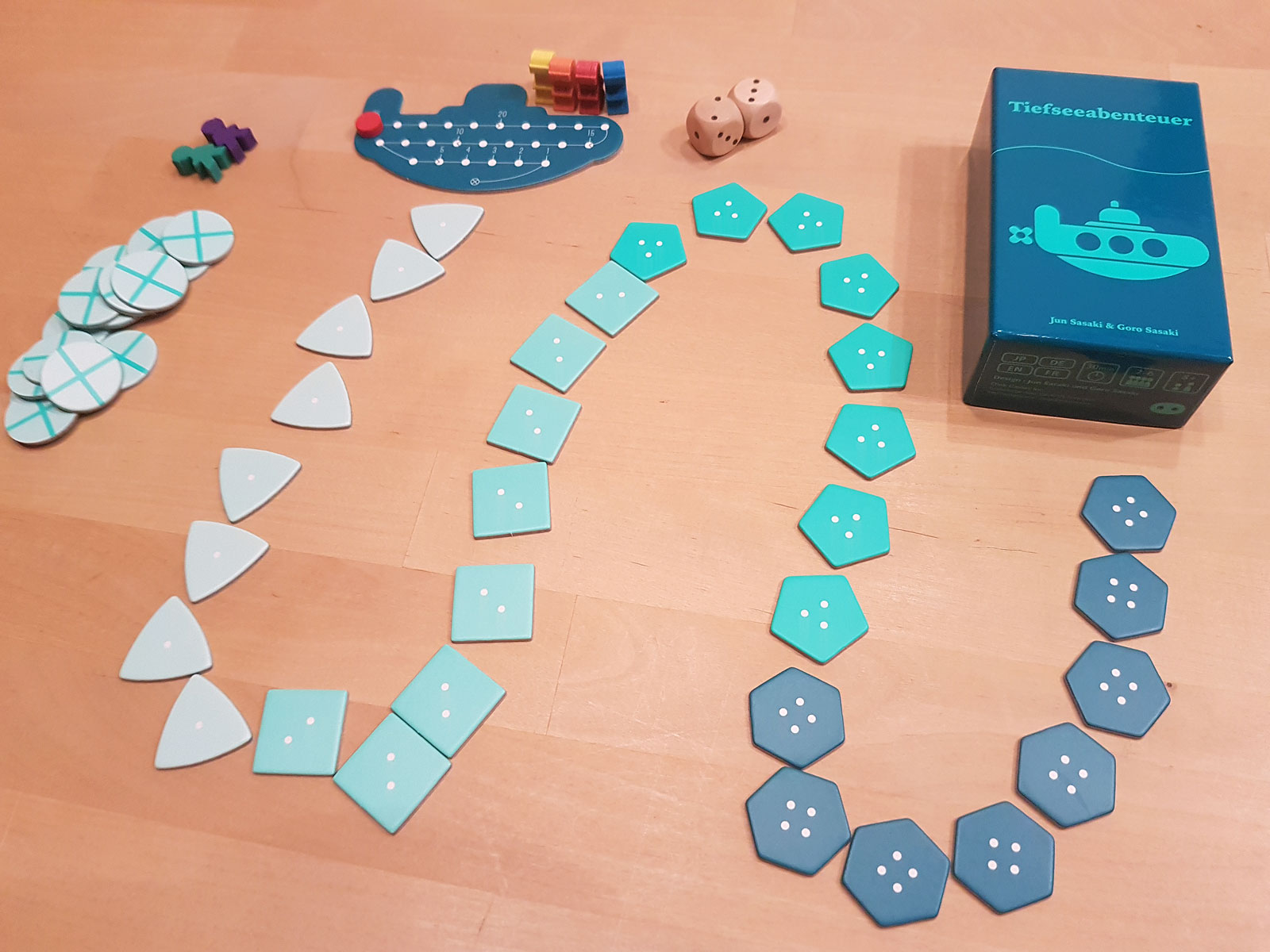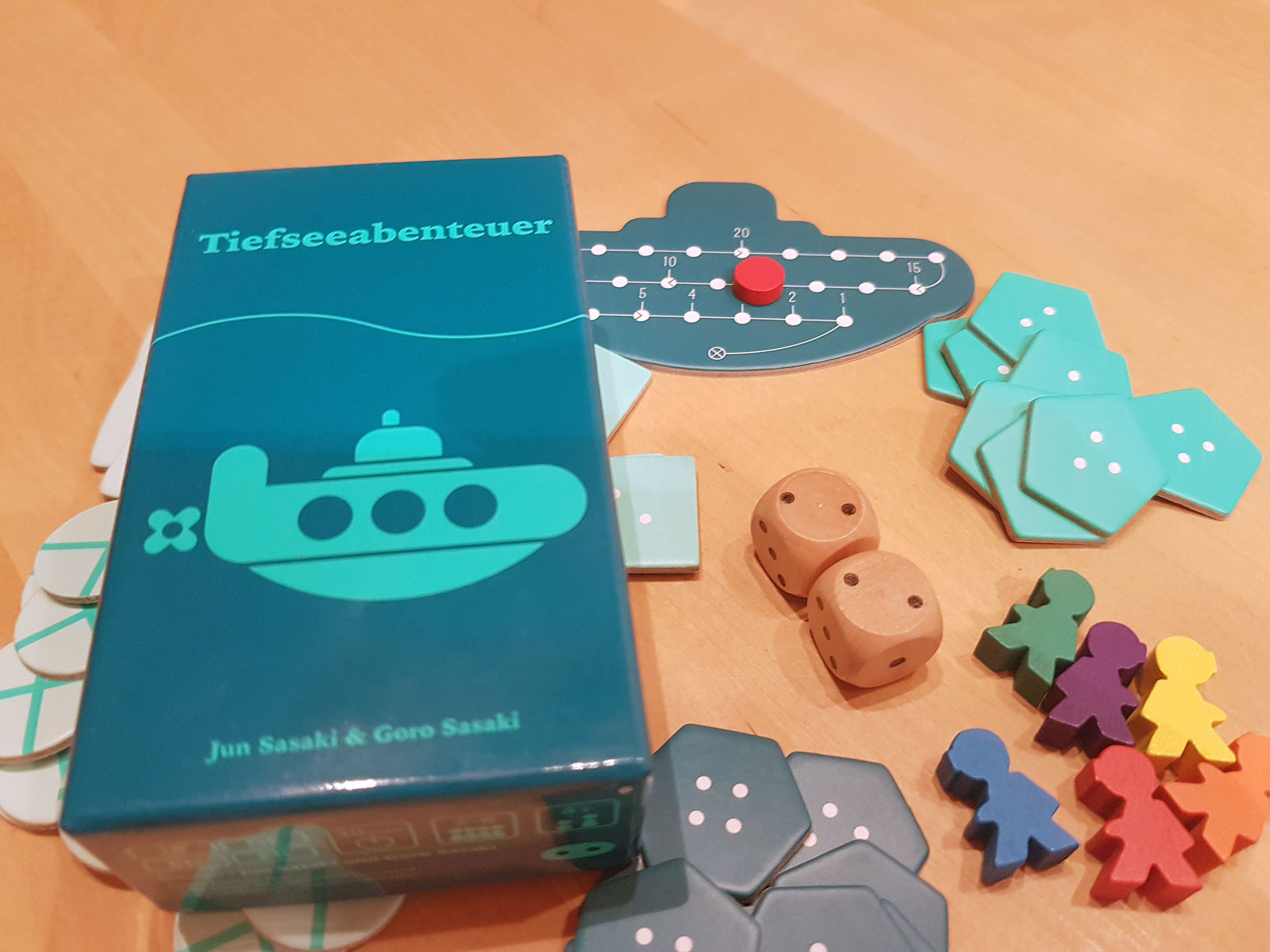 „Tiefseeabenteuer“ ist ein Würfelspiel mit einem besonderen Kniff. Jeder Spieler spielt für sich alleine, aber gemeinsam reduziert man die Anzahl an möglichen Zügen. Je mehr Schätze man trägt, desto schneller geht das Spiel zu Ende und man sollte vorher unbedingt das rettende U-Boot erreicht haben. Die mitgeschleppten Schätze machen es einem nicht einfacher, denn mit jedem Schatz reduziert sich die erwürfelte Zugweite um 1. Das Risiko abschätzen, aber auch viel Glück haben, führen zum Sieg. Fast zu viel Glück. Aber bei drei Runden gleicht es sich (hoffentlich) wieder aus.
