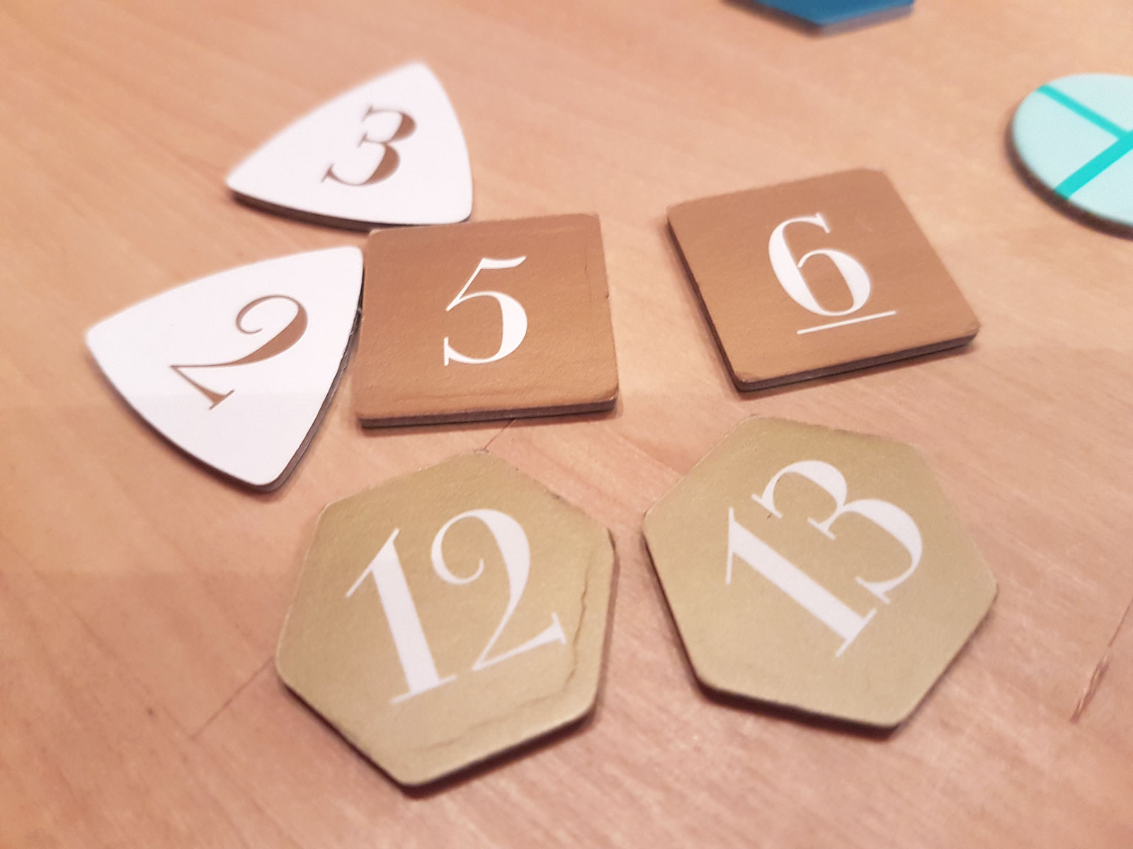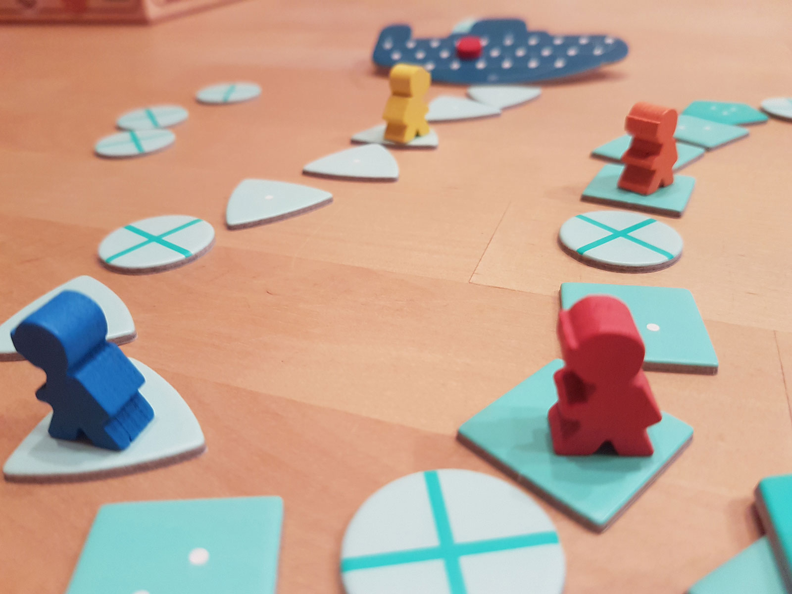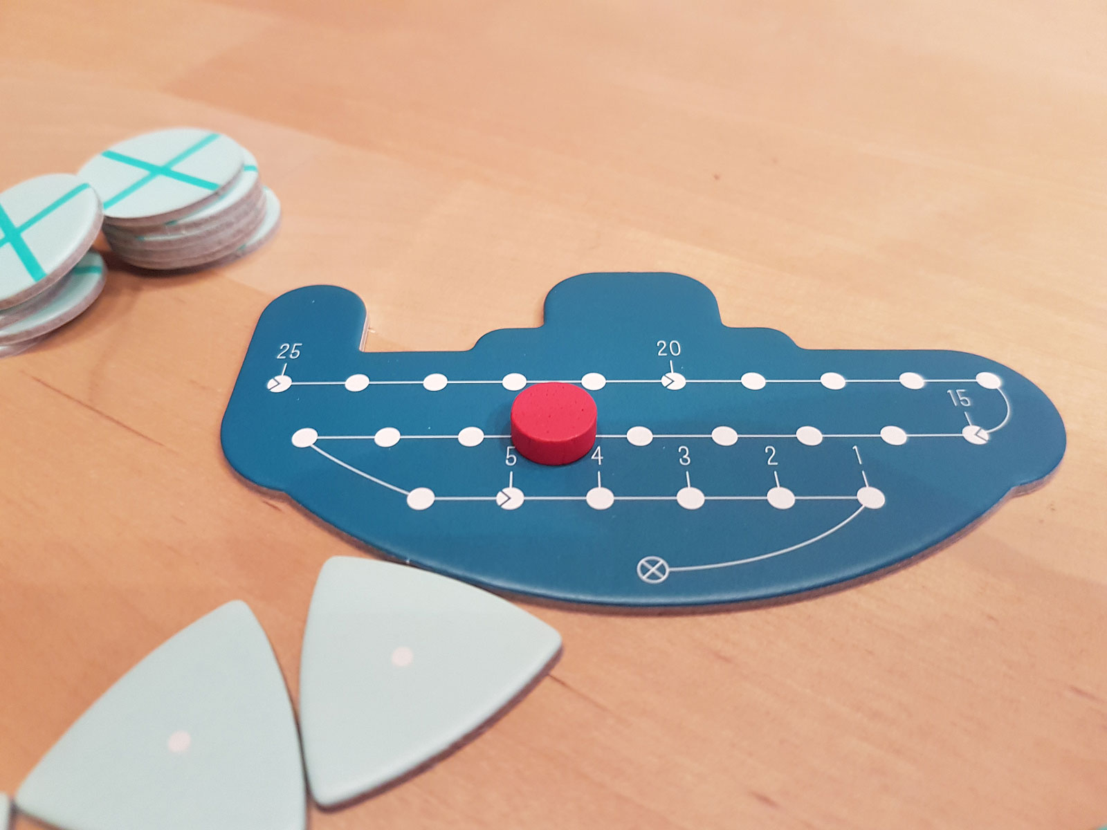 Unser Taucher startet wie alle anderen vom gemeinsamen U-Boot und bewegt sich entlang einer Reihe von Plättchen, die wir vor der Spielrunde ausgelegt haben. Diese entsteht aus vier Gruppen zu je acht Chips, jede Gruppe wird für sich gemischt und dann als Pfad ausgelegt. Auf der Rückseite haben die Chips unterschiedliche Punktwerte, die aber bis zur Rückkehr ins U-Boot für alle geheim bleiben. Die Chips, die weiter weg vom U-Boot sind, bringen deutlich mehr Punkte.