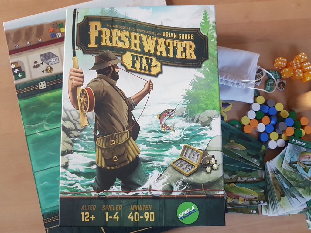 „Freshwater Fly“ von Brian Suhre, 1-4 Spieler ab 12, 75 min, erschienen 2019 bei Spielefaible, ist ein ruhiges und trotzdem spannendes, strategisches Angelspiel für spielerfahrene Gelegenheitsspieler mit leichtem Kennerspielniveau