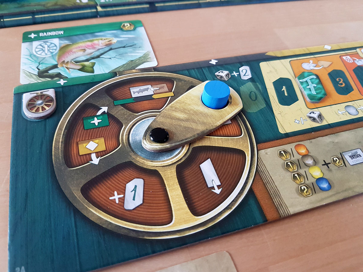 Einen Fisch zu fangen dauert. Gerade die dickeren Brocken verlangen Zeit. So vergehen mehrere Spielrunden, bis wir endlich die Leine komplett eingeholt und den Fisch an Land gezogen haben. Ganz wie das Angeln, es geht bedächtigt zur Sache. Nicht dass wir in der Zwischenzeit gar nichts zu tun hätten. O nein, es muss geplant und entschieden werden, wie stark wir die Leine einholen. Schneller ziehen birgt mehr Risiko, langsamer ziehen ermöglicht noch mehrere Boni mitzunehmen.