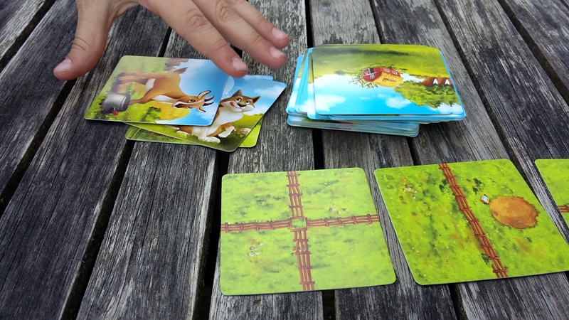 Das Kind, das an der Reihe ist, wählt sich eine Karte aus der Auslage aus, baut sie an seinen Bauernhof an und deckt für den nächsten Spieler eine neue Karte auf. Die Zaunkarten werden nun so angelegt, dass diese zusammenpassen und einen fortlaufenden Zaun ergeben. Idealerweise schafft man es so, Gebiete mit dem Zaun zu umranden. Denn wenn man es schafft, Weizen einzuzäunen, erhält man je Weizen einen Punkt am Ende vom Spiel. Außerdem sind auf manchen Karten Plätze für Tier abgebildet. Wenn man sich aus der Auslage eine Tierkarte auswählt, nimmt man sich so viele Tiermarker aus dem Hühnerhof, wie Tiere auf der Karte zu sehen sind und darf sie auf den dafür vorgesehenen Feldern platzieren. Deckt man als nächste Karte jedoch einen Wolf auf, laufen allen Kindern die Tiere weg, die nicht eingezäunt sind und von denen der Wolf träumt.