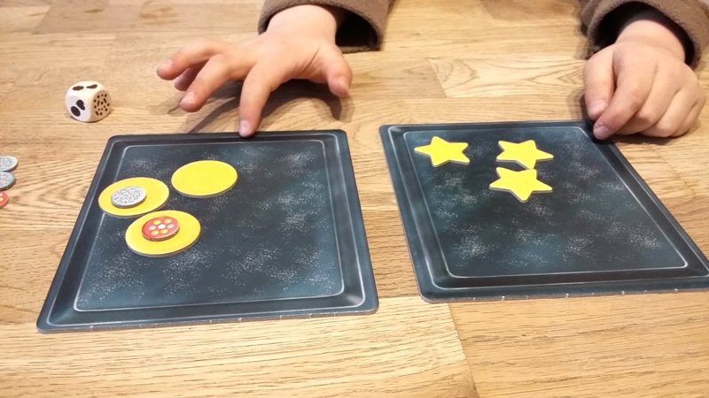 Das Kind, das an der Reihe ist, wirft alle drei Würfel und kann dann eine von drei möglichen Aktionen nutzen. Sofern Kekssymbole gewürfelt wurden, kann man sich für eine Keks-Art entscheiden und darf dann die gewürfelte Anzahl an Keksen – mit genau dieser Form – auf ein Backblech legen.