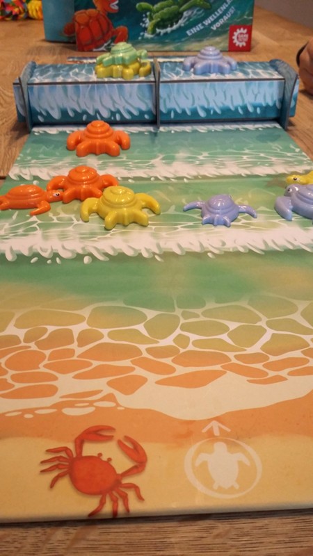 Wenn der Würfel jedoch eine Welle anzeigt, wird die Welle um ein Feld in Richtung Strand weitergezogen. Jede Schildkröte, die sich dann im Weg befindet, wird entsprechend wieder Richtung Strand geschoben. Kommt die Welle am Strand an, wird sie wieder ins tiefe Meer gesetzt und beginnt von dort aus wieder nach vorne zu wandern. Bei einem Wellensymbol darf der Spieler dann nochmal würfeln, ebenso, wenn er auf eine Schildkröte springt, oder eine überdeckt.