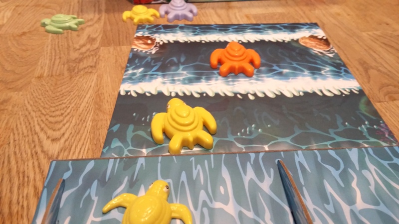Auch die Idee, auf Schildkröten springen zu können, um sich mit tragen zu lassen, oder andere zu überdecken, um sie am Ziehen zu hindern, gefällt uns sehr gut. Selbst Kinder ab 4 können diese Regeln mitunter schon gut verstehen und daher finden wir die Altersangabe ein wenig zu hoch angesetzt. Einziger Kritikpunkt ist ein gewisser Glücksfaktor. Durch das Bewegen der Welle kann es natürlich sein, dass jemand anderes gewinnt, obwohl man lange vorne lag. Und je nachdem wie oft die Welle gewürfelt wird, kann sich das Spiel auch mal in die Länge ziehen. Meist waren unsere Runden nach ca 20 Minuten beendet, es kamen aber auch längere Partien vor, da alle Schildkröten immer wieder an den Strand gespült wurden. Längere Runden ziehen sich für die Kinder dann zu sehr hin und lassen ihre Geduld schwinden.