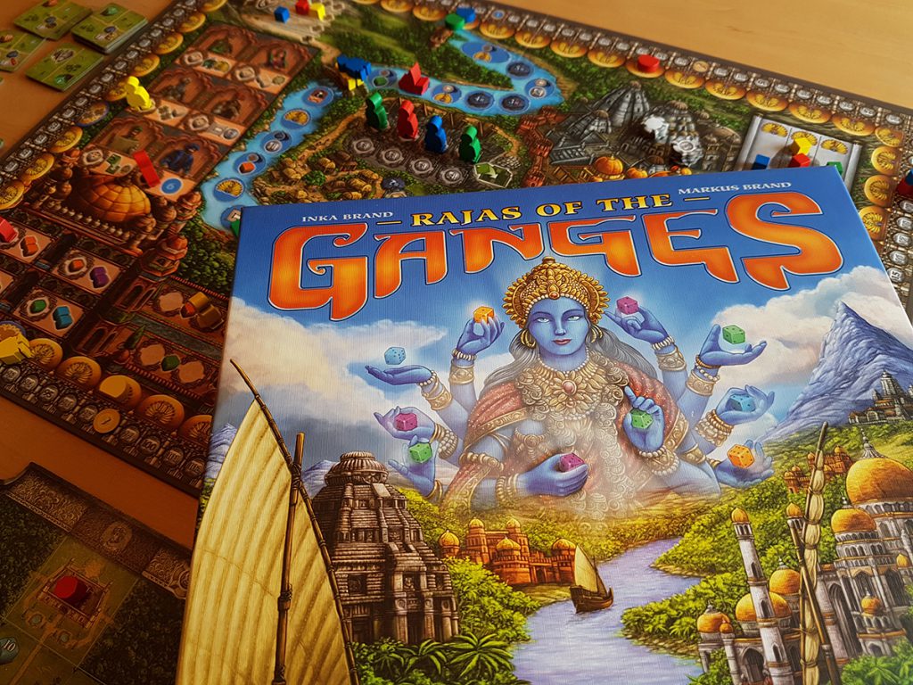 Was machen wir in Indien am Ganges? Das Spiel „Rajas of the Ganges“ ist ein Arbeiter-Einsetzspiel, bei dem die meisten Aktionen mit Würfel bezahlt werden müssen. Man erwirbt Würfel, wirft diese sofort und muss nun mit der gewürfelten Zahl „arbeiten“. Dabei kann man bis zu zehn Würfel ansammeln, denn manche Aktionen muss man mit mehreren Würfeln bezahlen. Und da kommt es auch auf die Farbe an, denn vier verschiedene Farben gibt es und beim Bau von Gebietsplättchen zahlt man mit der entsprechenden Farbe.