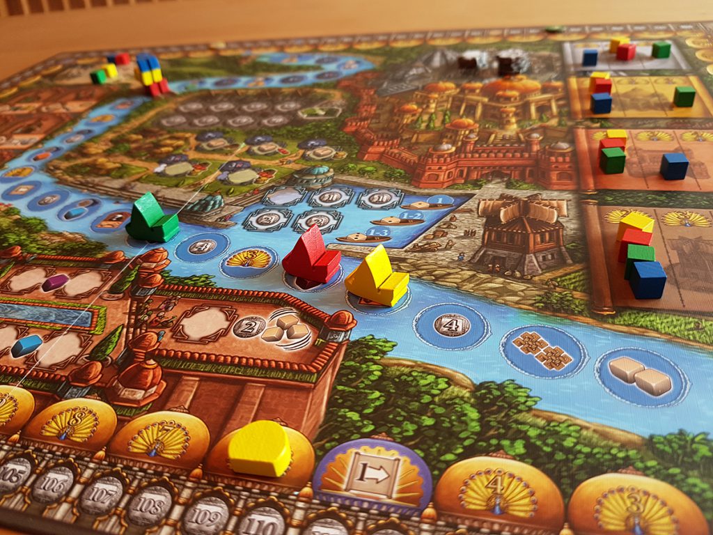 Auf anderen Aktionsfeldern kann ich Würfel erwerben, tauschen, oder mir Personen im Palast als Helfer engagieren. Ich kann meine Provinz ausbauen mit Märkten und Gebäuden. Mein Boot kann ich auf dem Ganges bewegen und auf den unzähligen Bonusfeldern zusätzliche Boni holen oder ich kann bereits gebaute Marktplätze noch einmal werten, um Geld zu erhalten. Ruhmespunkte erhalte ich vor allem durch den Bau von vier verschiedenen Gebäuden in meiner Heimatprovinz.