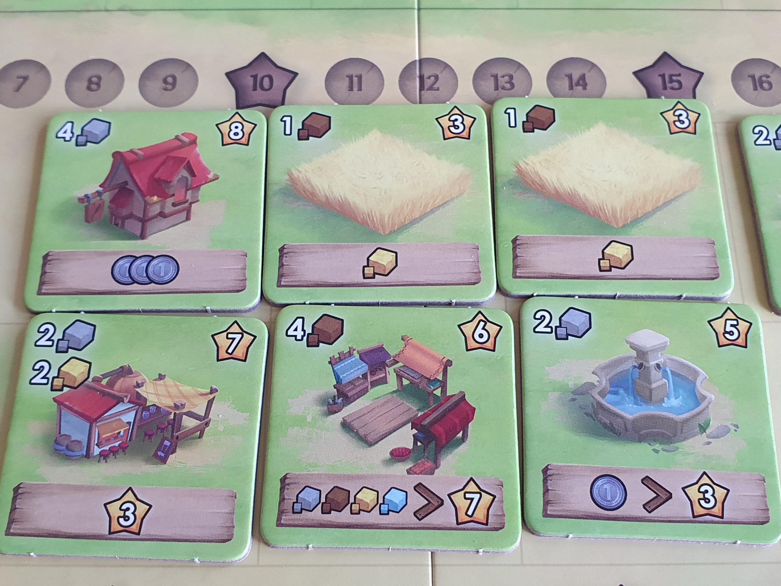 Mit diesen Rohstoffen kann man Gebäude erwerben, indem man einen Arbeiter auf das Baufeld stellt (hier können beliebig viele Arbeiter stehen), sucht das passende Gebäude aus, zahlt die geforderten Rohstoffe und legt das Gebäude auf ein freies Feld. Mit einem Häuschen der eigenen Farbe markiert man es als eigenen Besitz. Sogleich gibt es die aufgedruckten Siegpunkte. Der stärkere Effekt ist aber, dass nun dieses Feld besondere Vorteile verschafft. Dies gilt auch für die Mitspieler*innen, die aber für die Nutzung 1 Geld an den Besitzer / die Besitzerin zahlen müssen.