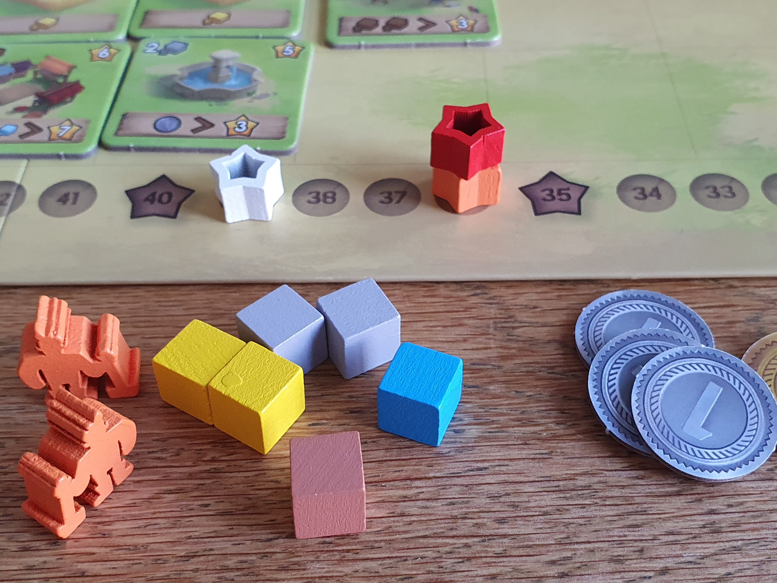 Je nach Spieler*innenzahl bekommt jeder eine Anzahl von Arbeitern, gespielt wird über vier Runden. Zu Beginn gibt es lediglich etwas Geld, die anderen Ressourcen bekommt man erst im Spiel.
