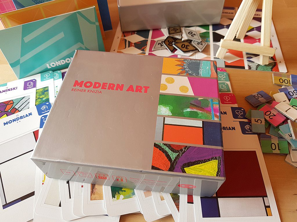 Modern Art von Reiner Knizia für 3-5 Spieler ab 10 Jahren, neu erschienen bei Oink Games 2017, ist ein Auktionsspiel um Gemälde moderner Künstler. In vier Runden ersteigert man Gemälde. Am Rundenende erhält man für seine gesammelten Werke Geld. Die Höhe ist abhängig, wie gefragt derjenige Künstler in allen Runden zusammen bis jetzt war.
