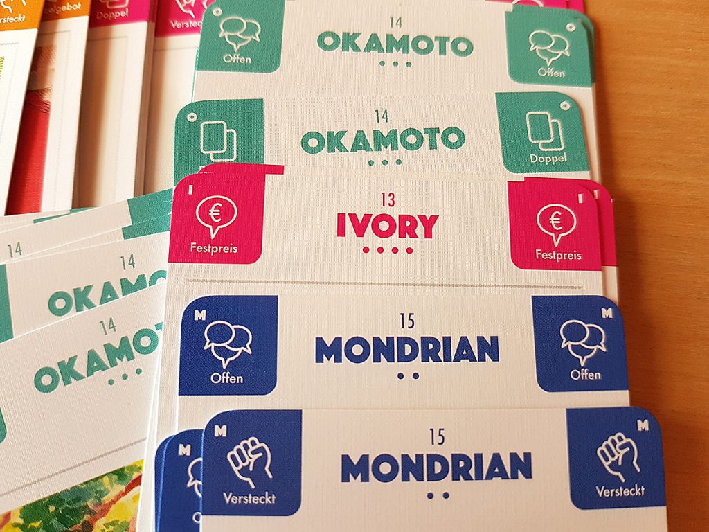 Jeder von uns hat Gemälde, moderne Kunst. Diese bietet er in seinem Zug zum Ersteigern an. Dabei bestimmt das Symbol auf der Karte, welche der Versteigerungsarten zum Einsatz kommt. Da gibt es die Klassische, wo jeder durcheinander ruft und irgendwann gibt es keinen mehr, der das Höchstgebot überschreiten will. Der zahlt dem Anbieter die Kosten. Ist es der Anbieter selbst, zahlt er an die Bank. Im besten Fall bietet niemand, dann behält sich der Anbieter das Gemälde für lau.
