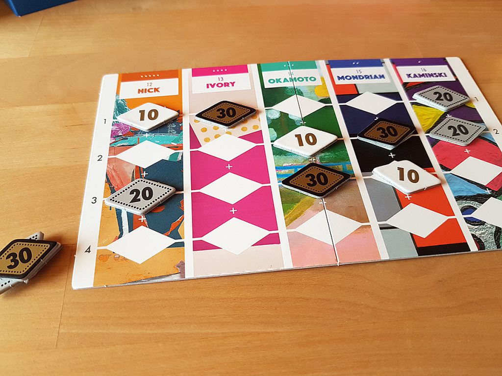 Jetzt müssen alle Spieler (nicht Künstler) ihre ausliegenden Gemälde verkaufen. Der Preis wird bestimmt durch die dem Künstler zugeteilten Punkte – über alle Runden hinweg. Da kann sich einiges ansammeln. Aber! Ein Künstler, der in dieser Runde keinen Wert hatte, verkauft sich für Null. Egal, ob er in den vorherigen Runden Punkte sammeln konnte oder nicht. Ärgerlich, wenn man genau von so einem Künstler gerade ein paar Gemälde vor sich hat.