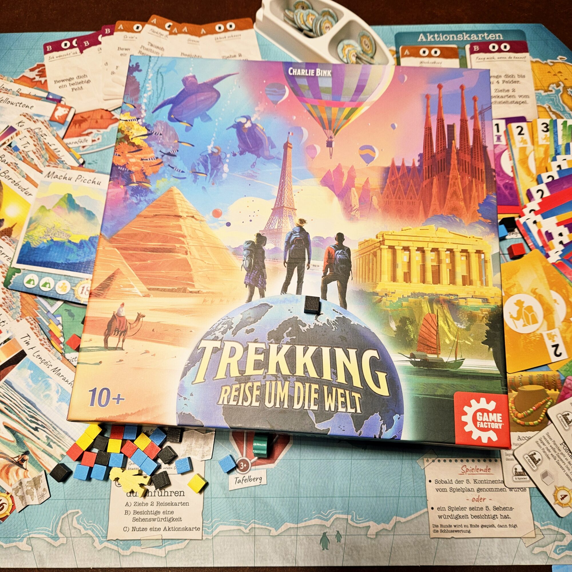 Inhaltlich hat die Trekking-Reihe zwar nichts mit Lichtschwertern oder Yedi zu tun, allerdings erlaubt sich der deutsche Verlag Game Factory bei der Veröffentlichungsstrategie dieser Spiele eine ebenso kreative Abweichung von der vom Autoren Charlie Bink erdachten Reihenfolge. Das erste Spiel der Reihe, Trekking the National Parks, ist vielleicht ob des lokal auf die USA zugeschnittenen Themas noch überhaupt nicht auf Deutsch erschienen. Der erste Teil hierzulande war Trekking – Reise durch die Zeit (in Amerika der dritte veröffentlichte) und der zweite Titel jetzt ist Trekking – Reise um die Welt. Wie der Name sagt, reisen wir um die Welt, besichtigen Sehenswürdigkeiten und sammeln Souvenirs. Alles, indem wir Karten mit unterschiedlichen Farben und Zahlen ausspielen. Damit ist das Spiel schon recht gut zusammengefasst.