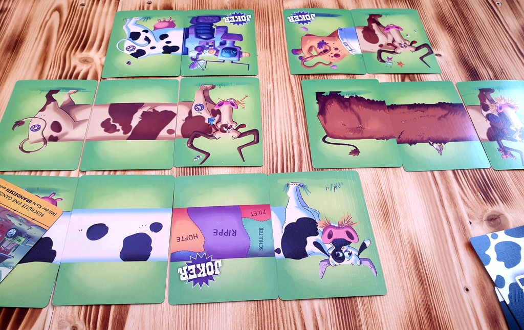 Danach dürfen beliebig viele Handkarten ausgespielt werden. Kühe müssen allerdings komplett mit Vorder- und Hinterteil ausgelegt werden und für Kälber (die am Spielende auch einen Punkt geben) muss bereits eine Kuh in der Herde vorhanden sein. Jokerkarten ermöglichen ebenso Kühe zu vervollständigen, wie Aktionskarten, die Rassemischungen möglich werden lassen. Man hat also durchaus mehrere Möglichkeiten, seine Herde zu vergrößern, auch wenn es stark vom Glück abhängig ist, wieviel der begehrten Kuhkarten man ergattern kann.