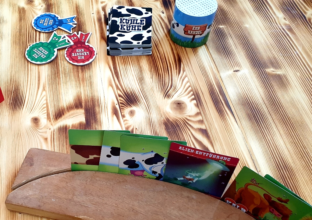 Und so geht es bei Kuhle Kühe Runde um Runde darum, seine Herde zu vergrößern und den anderen die Suppe zu versalzen. Der Ärgerfaktor ist allerdings nicht so hoch, als dass es einem das Spiel komplett madig machen würde. Schließlich kann man wahrscheinlich schnell zurückschlagen. Außerdem huscht bei jedem Einsatz des Kuhhandels selbst den SpielerInnen mit der kleinsten Herde wieder ein Lächeln übers Gesicht. Denn die beigelegte Dose, die zum Handeln benötigt wird, muht tatsächlich wie eine Kuh. Und das ist lustig.