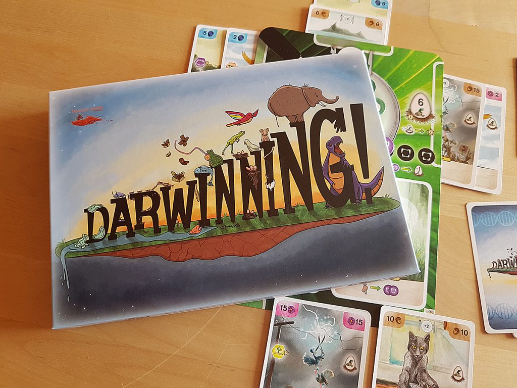 Reden wir über das Stichspiel Darwinning, Schon der Titel ist ein schönes Wortspiel. Hier geht es also um die Entwicklung der Lebensformen, ihre Anpassung an die Umwelt, die Überlebenschancen, wenn die anderen Tiere, die in der Nahrungskette vor einem sitzen, ständig über einen herfallen. Das Ganze ist eine wunderschöne und wie wir gleich sehen werden, durchaus fordernde Verpackung für ein Stichspiel.