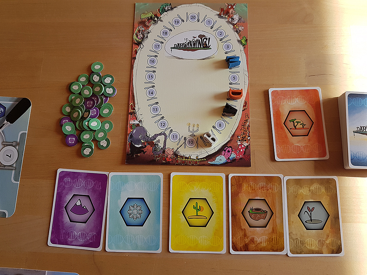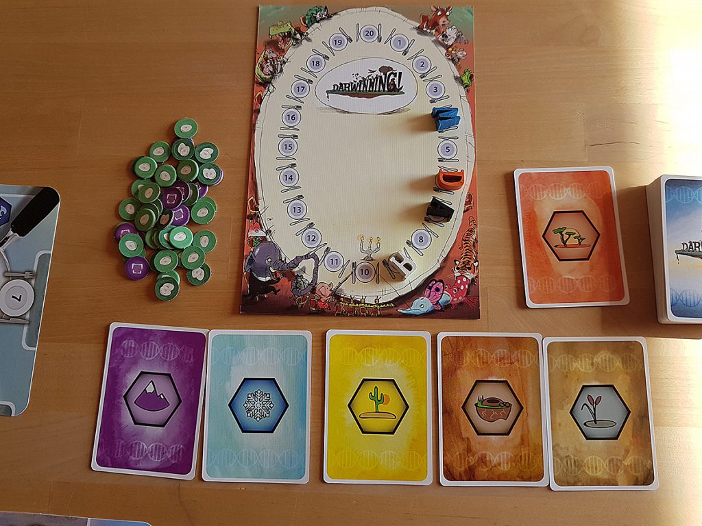 „Darwinning“ ist ein Stichspiel. Dabei geht es aber weit mehr als nur um Kartenspielen. Hier müssen wir uns um eine zufällig erhaltene Spezies kümmern. Diese will wachsen, tut das aber nur, wenn genug Nahrung vorhanden ist. Also müssen wir unsere Spezies im Lauf des Spiels an unterschiedliche Umgebungen anpassen. Außerdem müssen wir verhindern, dass sie durch Tiere, die höher in der Nahrungskette stehen, gefressen und ständig dezimiert werden. Aber die Nahrung von unterlegenen Tieren zu holen und deren Populationen klein zu halten ist genauso wichtig. Am Ende, nach drei Runden, zählen die Punkte, und die setzen sich aus der Größe der Population und der Stufe auf der Nahrungskette zusammen. Da startet man zwar sehr unterschiedlich, eine Spezies z. B. auf der 3, eine andere auf der 10, aber das Spiel gleicht das schön aus.