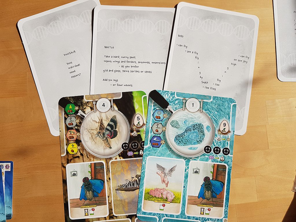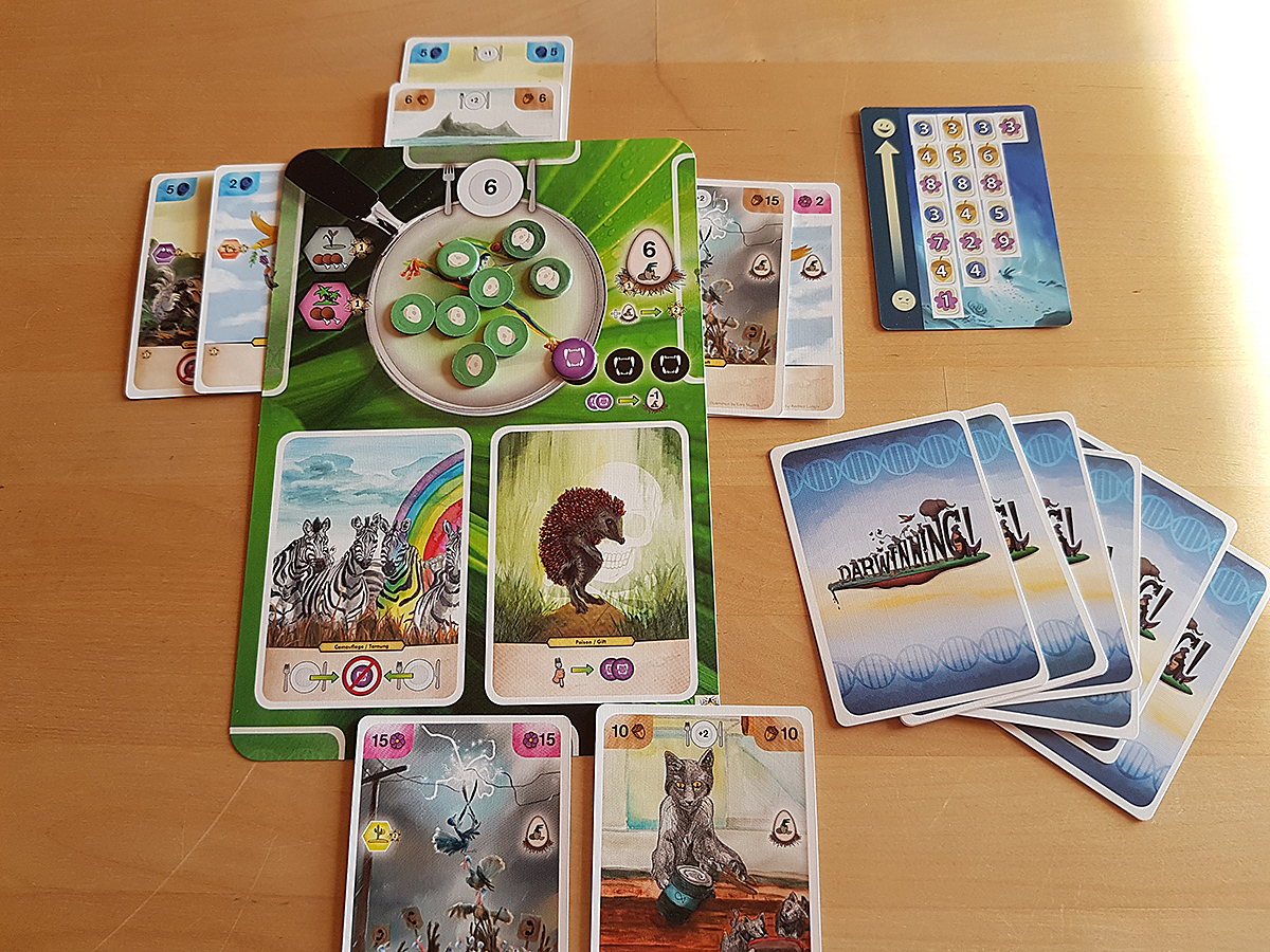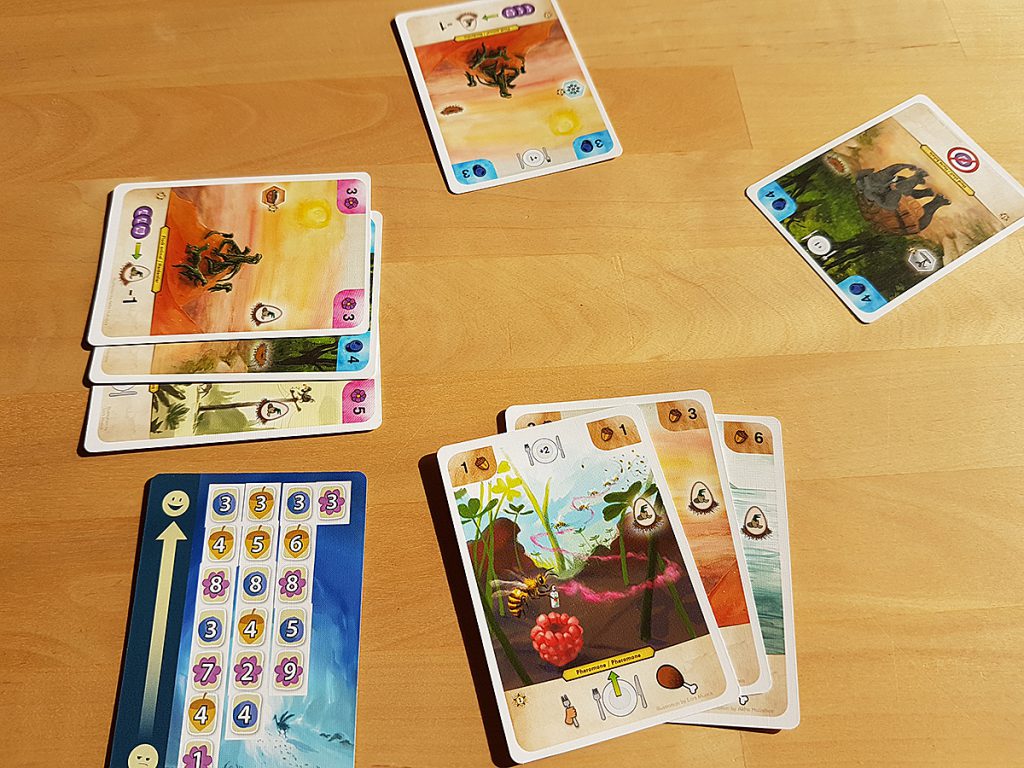 Fassen wir zusammen. Ich muss schauen, dass ich meine Spezies entwickle. Dazu muss ich Karten anlegen. Dazu muss ich Stiche machen. Also muss ich meine Karten gut kombinieren, wobei in der Kombination natürlich auch gewünschte Karten sein sollten, denn mache ich den Stich, kann ich genau eine der ausgespielten Karten anlegen. Aber ich muss auch schauen, dass mir eine Karte für den Schluss bleibt, die meiner Spezies hilft und möglichst nicht sticht. Wow, was sich zuerst wie ein Stichspiel anhört, bekommt plötzlich soviel Tiefe, dass man schon mal ins Grübeln kommen kann, kommen muss.
