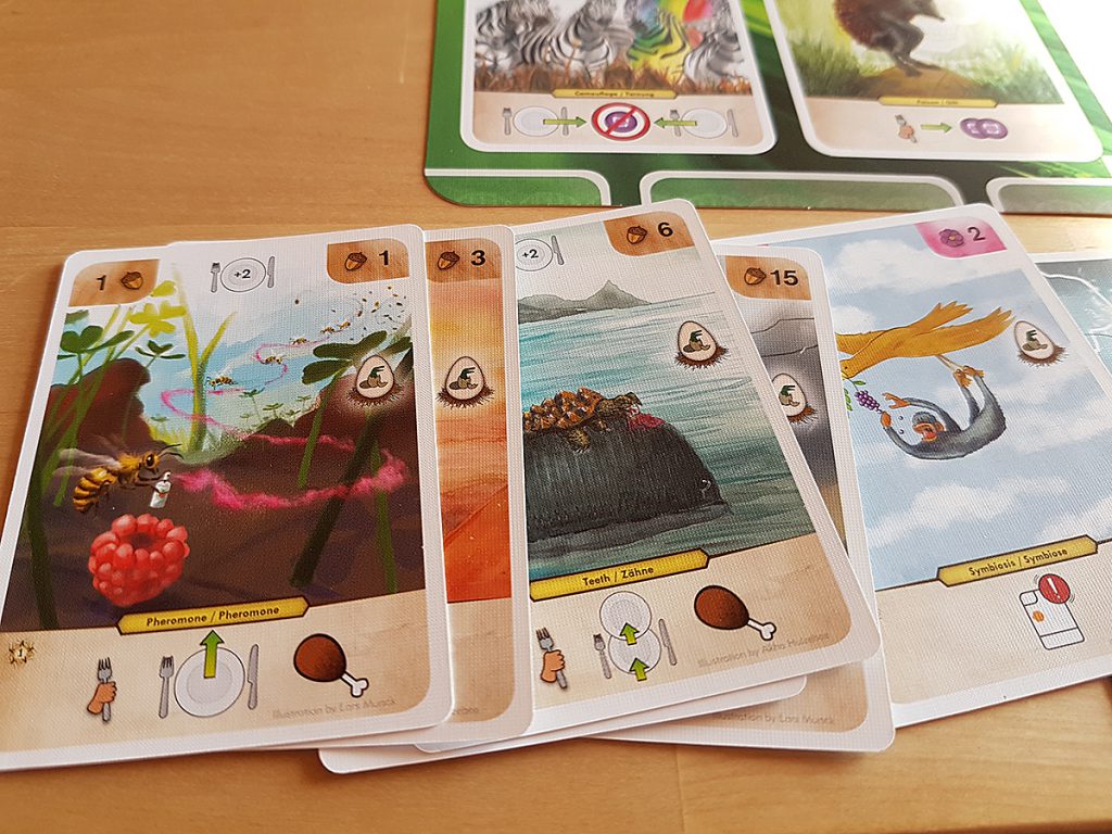 Wer den Stich macht, hat anschließend die Qual der Wahl, eine seiner gespielten Karten an sein Artenblatt anzulegen. Damit wird seine Spezies aufgewertet. Entweder sie passt sich an eine neue Landschaft an und findet dort Nahrung, oder sie steigt in der Nahrungskette auf, oder die Population wächst. Oder, und das ist wirklich interessant, sie erhält eine neue Fähigkeit, die sich entscheidend auswirkt. Da gibt es die Möglichkeit, eine harte Schale zu entwickeln und schon kann sie nicht mehr gefressen werden. Oder man lernt Lagerhaltung und hat immer ein bisschen Nahrung in der Hinterhand (oder an den Hüften?). Hier gibt es 15 verschiedene Spezialisierungen, die, jede für sich gut eingesetzt, richtig was bringen.