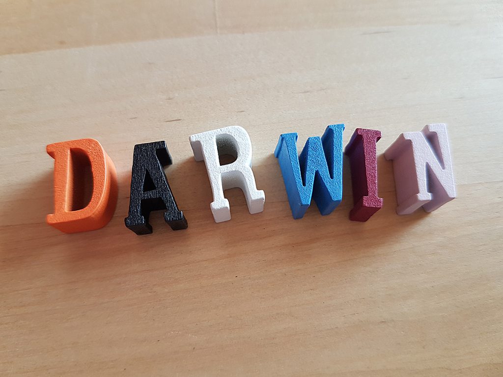 Dafür sind die Spielmarker ein Hinkucker. Das sind nämlich die 3D-Holzbuchstaben „D A R W I N“, das gefällt. Eine so gute Idee, dass das Spiel den wichtigen Ersteindruck bei den Spielern schon mal positiv gestaltet. Da die Schachtel selbst nicht wirklich toll im Regal aussieht, hat man aber das Staunen der Spieler mit diesen Buchstaben gewonnen. Ein guter Einstieg!