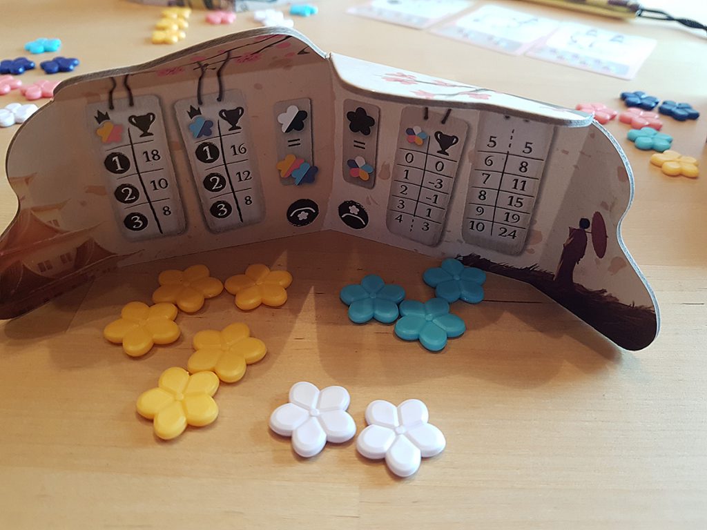 Am Ende gibt es Punkte für die vor dem Schirm offen liegenden Blüten. Da kann jeder abschätzen, wie er punktemäßig steht. Aber die Blüten hinter dem Schirm, die geheimen, bringen dicke Punkte und werfen oft das Ergebnis komplett um. Man sollte nicht zu früh aufgeben in diesem Spiel und bis zuletzt sein Glück versuchen.