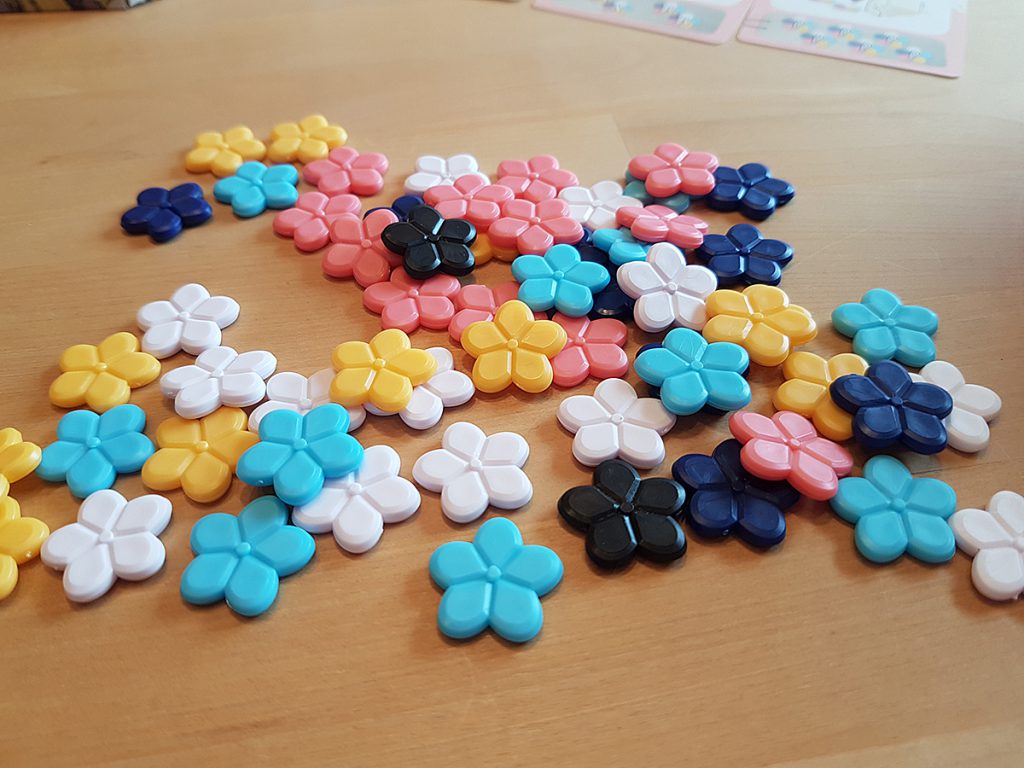 Das Material ist sehr gut gestaltet, die Plastikblüten sehen auf dem Tisch sehr schön aus, der Beutel ist hochwertig und es macht haptisch Spaß, die Blüten aus dem Beutel zu ziehen. Und auch nach mehrmaligen Spiel leidet das Material nicht, die Blüten sind abwaschbar und der Beutel wirkt pflegeleicht. Leider sind die Farben schwarz (die schwarzen Blüten dienen als Joker) und dunkelblau nur schwer zu unterscheiden. Die Anleitung ist ausführlich, mit vielen hilfreichen Beispielen bebildert und so kann man schnell ins Spiel eintauchen.