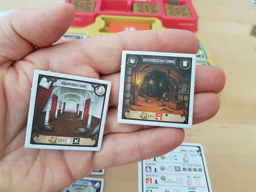 Man verhandelt gleichzeitig mit den SpielerInnen, welches der zwei Plättchen, die jeder zur Verfügung hat, wie angebaut wird und man selbst entscheidet, welches für welches Schloss idealer ist. Da können die Diskussionen schon mal schwierig und langwierig sein. Was heißt, können Sie es werden. Und das ist ein Problem im Spiel, aber bei Weitem nicht das größte.