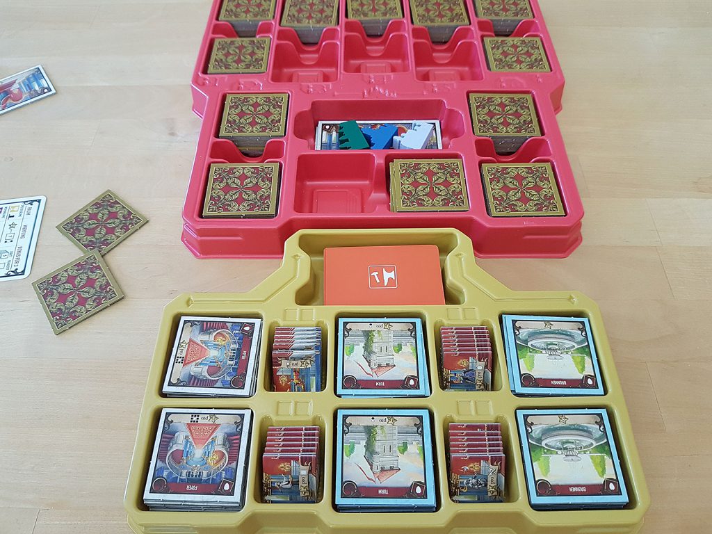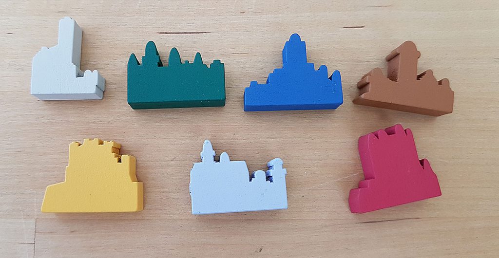 Zurück zu unseren Schlössern. An beiden bauen die SpielerInnen, eines links und eines rechts. Und das macht jeder. Und an dem Schloss „zwischen zwei SpielerInnen“ bauen sie gemeinsam. Also baut jeder der SpielerInnen jeweils gemeinsam mit dem Nachbarn an einem Schloss. Koorperativ sozusagen. Aber das Spiel ist nicht kooperativ. Denn am Ende entscheiden die Punkte, die das punkteärmste Schloss eines jeden Spielenden bringt. Und erst dann entscheidet die Punktzahl des jeweils anderen Schlosses. Das ist ein toller Spielansatz. Man spielt miteinander und doch gegeneinander, muss sich mit den beiden Nachbarn abstimmen und doch darauf achten, dass das jeweils andere Schloss optimal ist.