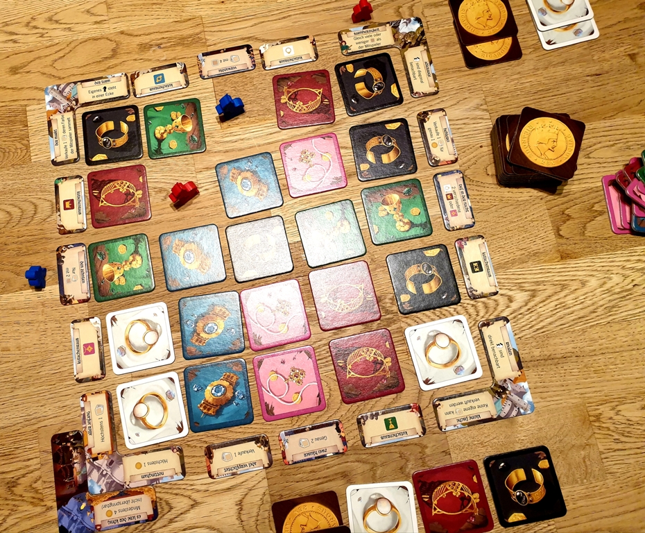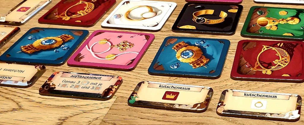 Was mir leider nicht so gut gefallen hat, ist die Icon-Sprache. Diese ist für keine der MitspielerInnen gut zu verstehen gewesen. Es wurde immer wieder überlegt, ob das Symbol nun das Kartenset oder eine Einzelkarte meint. Hier wäre es besser gewesen, das Wort „Set“ auszuschreiben, das hätte kaum mehr Platz auf den Plättchen benötigt, aber Missverständnissen vorgebeugt.