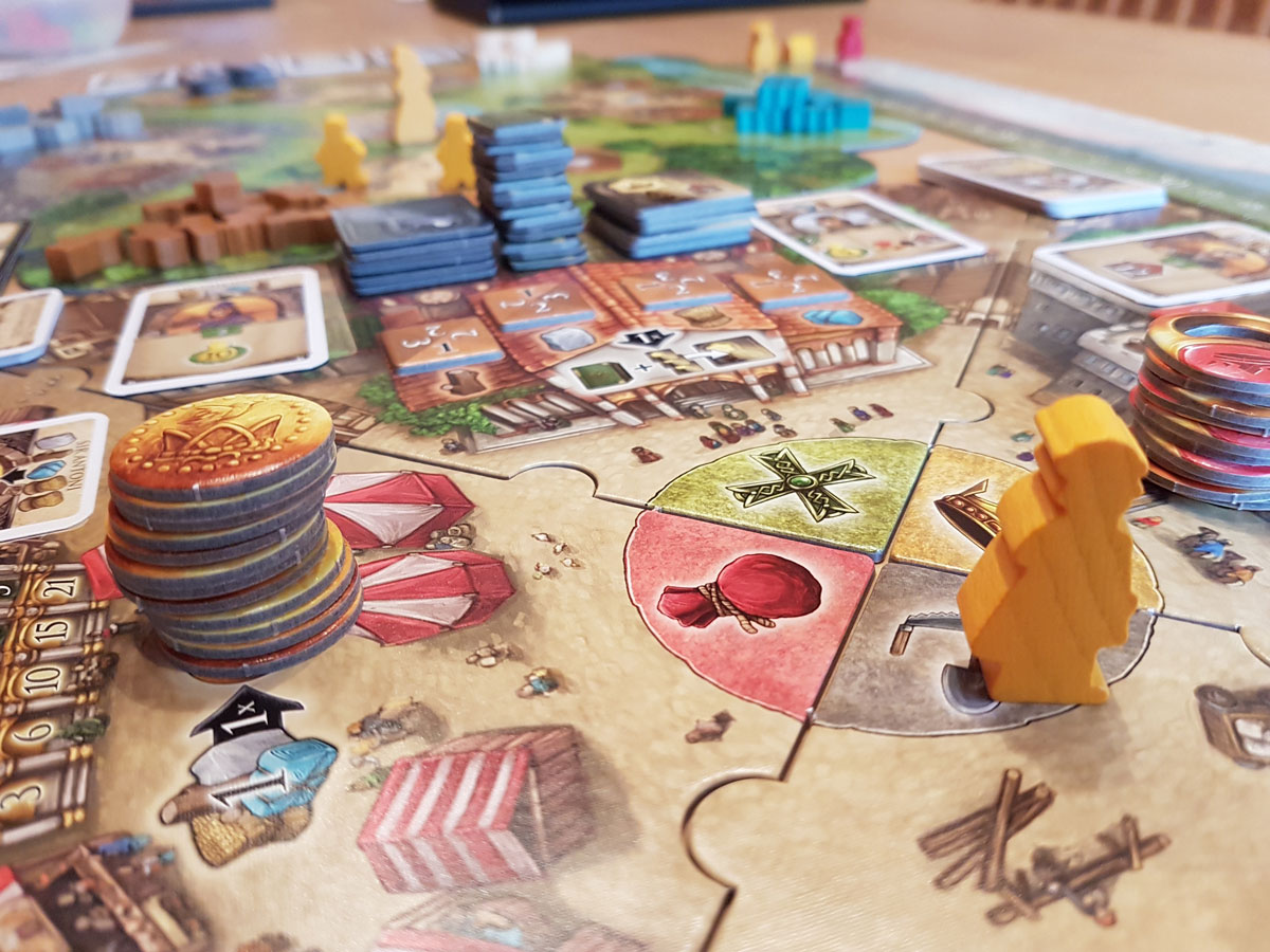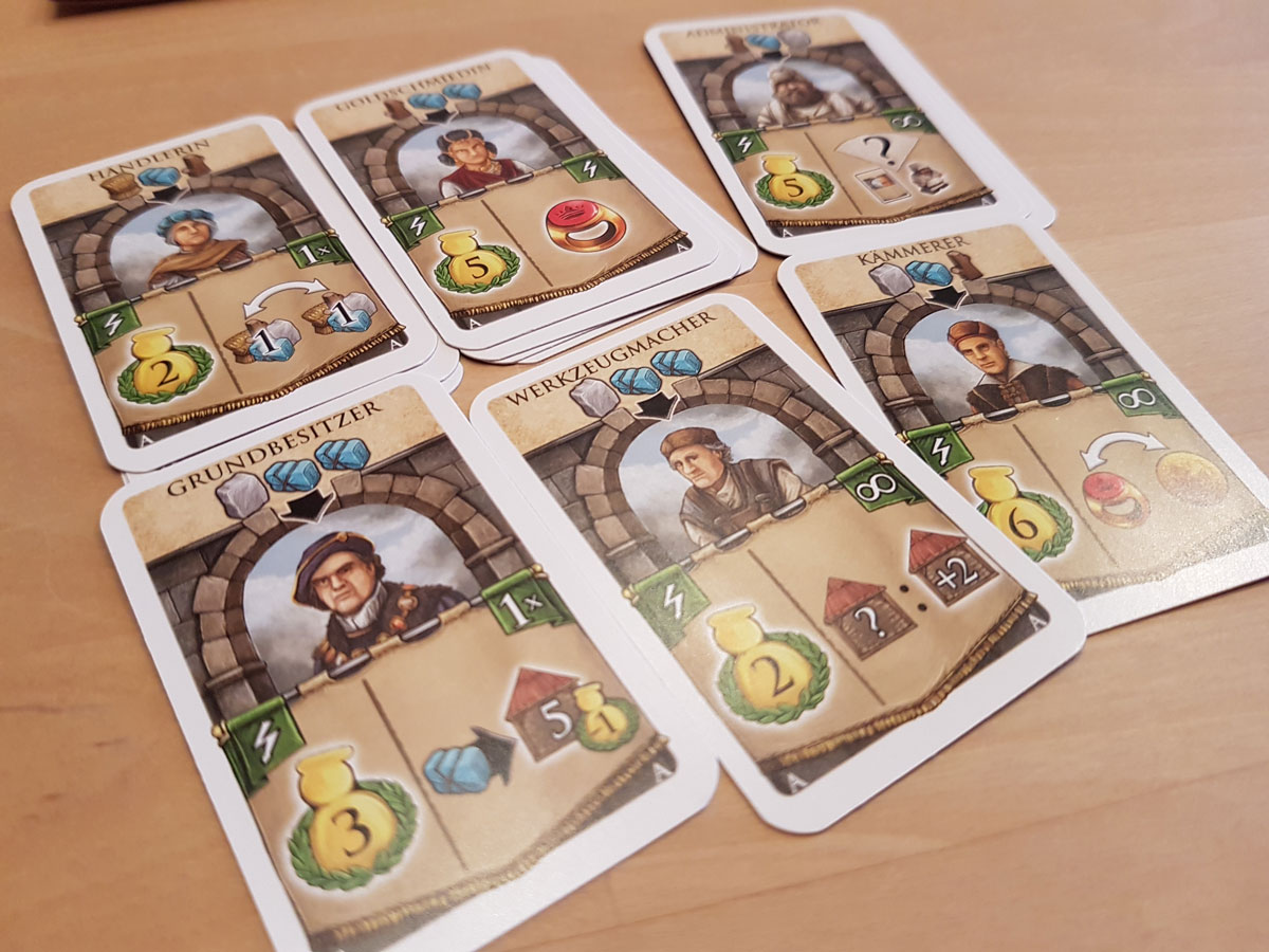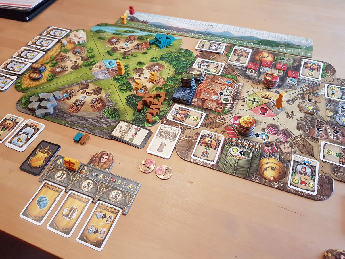 Man spielt zweimal drei Runden und man spielt auf zwei Plänen. Auf dem einen (Land) sammelt man Ressourcen, setzt seine Arbeiter ein, um mehr Ressourcen bzw. das lukrative Brot zu erhalten. Auf dem anderen Plan (Stadt) wandelt man Ressourcen in wertvollere Ressourcen um bzw. generiert Schritte auf den beiden Punkteleisten. Die eine Leiste zeigt den Gewinn an Bürgerpunkten, die andere an Baupunkten. Am Ende zählt von beiden Leisten nur der kleinere Wert. Das ist tricky, denn Punkte nur auf einer Leiste machen bringt keinen Sieg. Darum kann man sich nicht auf eine Sache spezialisieren, sondern muss immer beide Leisten im Auge behalten.