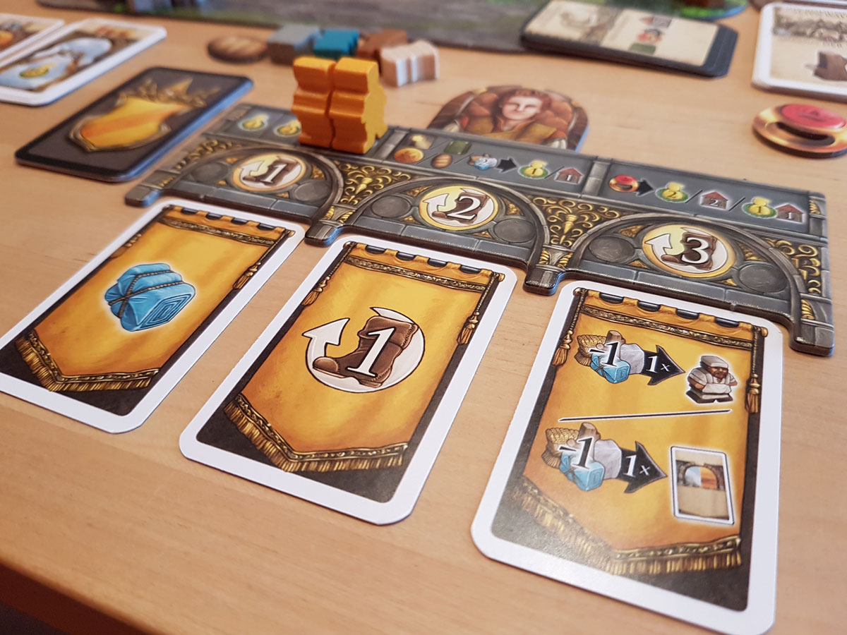 Auf beiden Plänen gibt es vier Felder, die mit jeweils einer Figur im Uhrzeigersinn umkreist werden und dabei die entsprechenden Aktionen ausgelöst werden. Wie weit man dabei ziehen darf, bestimmt der Ablageplatz der gespielten Karte. Man hat zu Beginn jeder Runde drei Karten, die man im Lauf des Zuges auf die Felder mit 1, 2 oder 3 Schritten ablegt. Dann erhält man den Vorteil, der auf der Karte abgebildet ist (meist eine Ressource) und kann dann die Aktion auf dem Feld machen.