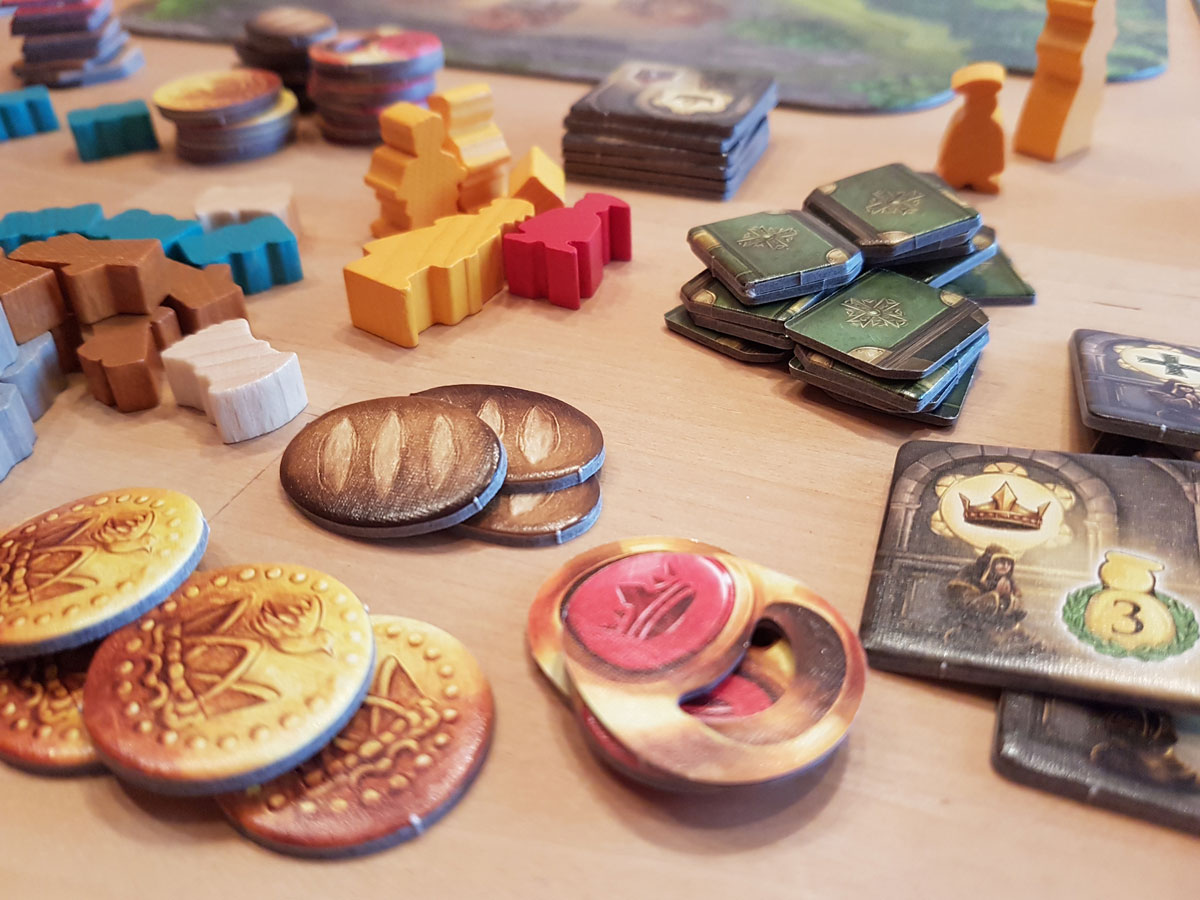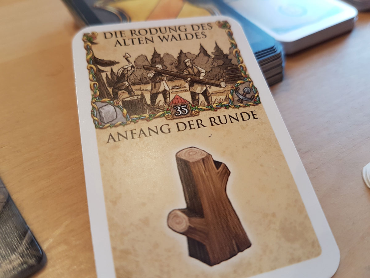 Und da kommt auch die Interaktion ins Spiel. Während man sich auf den Aktionsfeldern nicht in die Quere kommen kann, sind diese Felder schon umkämpfter. Und man kann einem Mitspieler, der darauf spekuliert, mit seinen zwei Holz eine schöne Spende an die Kirche abzuliefern, die Tour vermasseln. Man spendet selbst zwei Holz und schon muss der nächste drei Holz spenden. Das kann schon mal die komplette Planung der Runde über den Haufen werfen. Und das ist richtig gut gemacht. Interaktion mit der richtigen Tiefe, es ist kein Kampfspiel, meistens spielt man für sich selbst, aber dann kommen diese Momente, wo man Nadelstiche setzen kann.