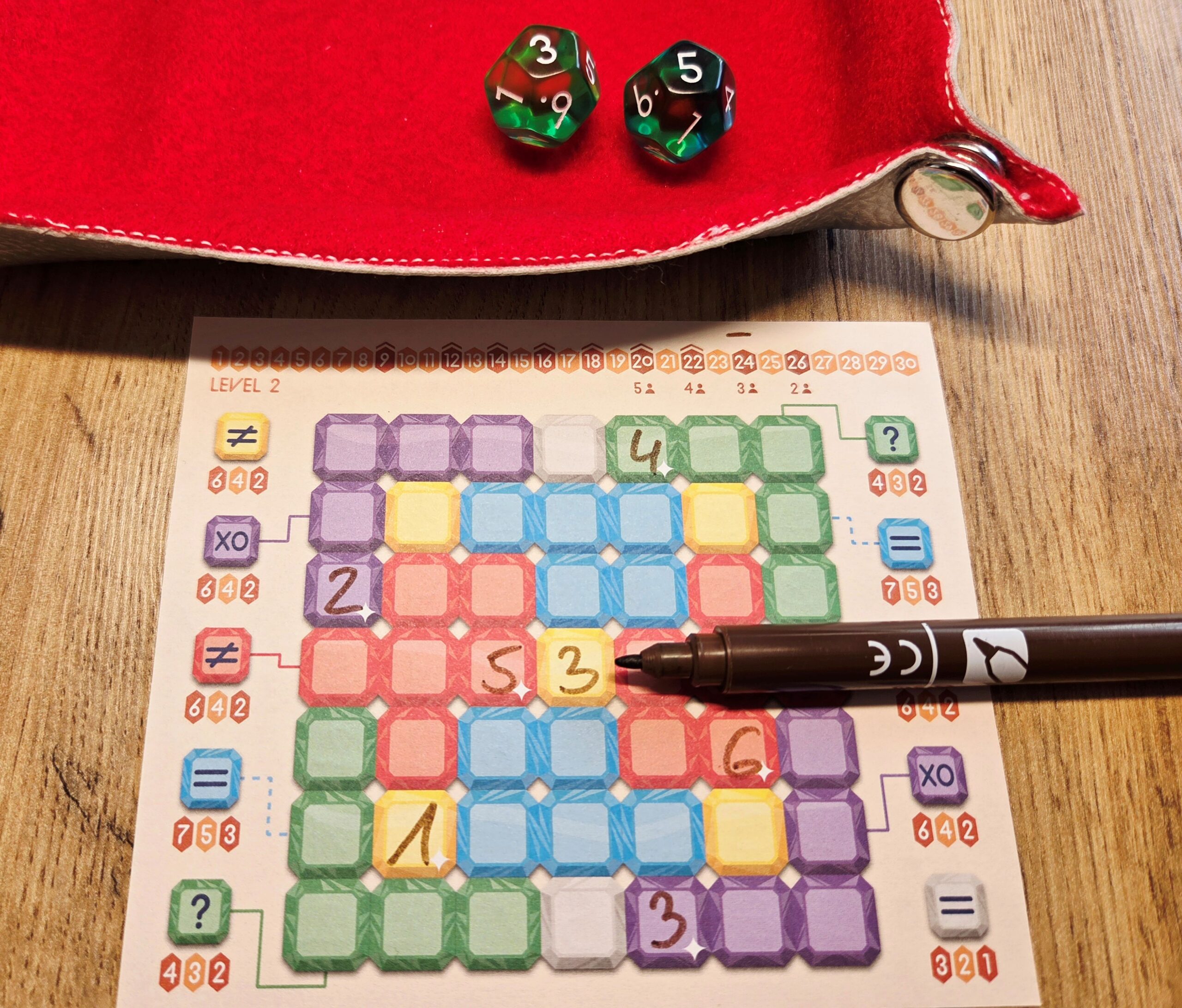Natürlich gibt es noch ein paar Vorgaben für das Eintragen der Zahlen in den verschiedenen Gebieten auf dem Spielblatt. Aber auch das ist nicht unnötig kompliziert und auf den Spielblättern eindeutig dargestellt. Bei den Leveln 3 & 4 zieht das Niveau noch ein wenig an. Was rein über die Anordnung und Aufteilung der Areale gesteuert wird und nicht durch weitere Ergänzungen der Regeln.