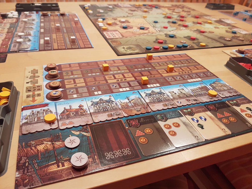 Das ist richtig gut miteinander verzahnt und trotzdem spielt es sich schnell und flüssig. In Europa gibt es dann auch noch die Sklavenkarten. Die sind ziemlich stark. Und wer jetzt wegen der Sklaverei im Spiel aufschreit – ruhig Blut. Denn es gibt auch die Möglichkeit, die Sklaverei im Spiel abzuschaffen. Das kann ein Spieler, der in Europa genug Präsenz zeigt und die entsprechende Karte nimmt. Die Folge ist für die „Sklaventreiber“ verheerend, denn sie müssen dann alle ihre Sklavereikarten abgeben und verlieren sofort ihre entsprechenden Fortschritte. Das ist noch so ein genialer Moment im Spiel.