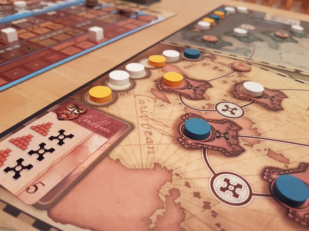 Wie entwickle ich mich auf der Industrieleiste wie auch auf jeder der anderen Leisten? Dazu muss ich mit einer Segelaktion neue Routen ergründen oder Städte unter meine Verwaltung bringen. Dann erhalte ich einen offen liegenden Marker, der mir auf einer der Leisten einen Schritt vorwärts erlaubt. Außerdem kann ich, vorausgesetzt eine Kolonie ist bereits gegründet und ich habe genug Präsenz in dieser Gegend, mir Karten nehmen, die mir gleich mehrere Schritte auf unterschiedlichen Leisten ermöglichen. Um mehrere solcher Karten nutzen zu können, muss ich aber auch auf der Einflussleiste vorwärts ziehen. Denn habe ich zu viele Karten, muss ich einige abgeben und verliere damit auch meine Fortschritte auf den Leisten.
