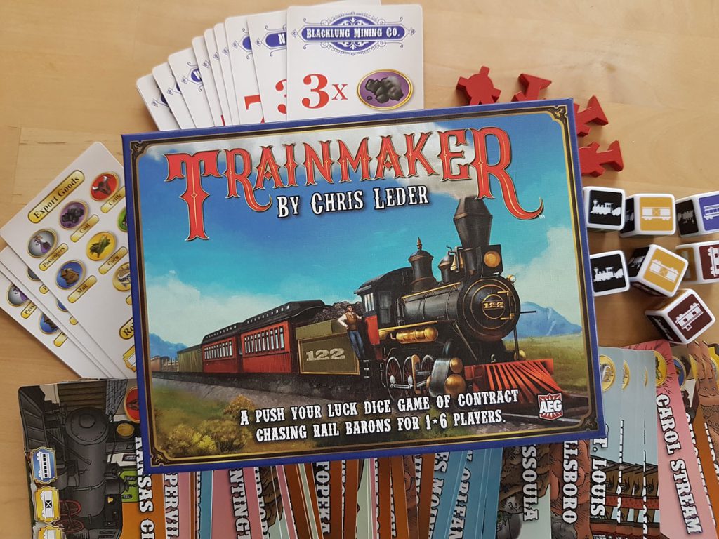 Trainmaker von Chris Leder, Grafiken von Jason Glover und Chris Leder, für 1-6 Spieler ab 14, erschienen 2018 bei Alderac Entertainment Group AEG, ist ein „Probier dein Glück“-Spiel, eine Kniffel-Variante, die es einem aber schwer macht. Denn es gibt nur gelungene und misslungene Würfe und die letzten überwiegen deutlich. Unnötig schwer wird die Aufgabe mit der Pflicht, den gebauten Zug mit einem gewürfelten Dienstwaggon abzuschließen. Wer Würfelspiele mag, hat eine interessante Variante auf dem Tisch, für andere kann es schnell zäh und frustrierend werden. Meine Empfehlung: Nur für Würfel-Enthusiasten empfehlenswert.