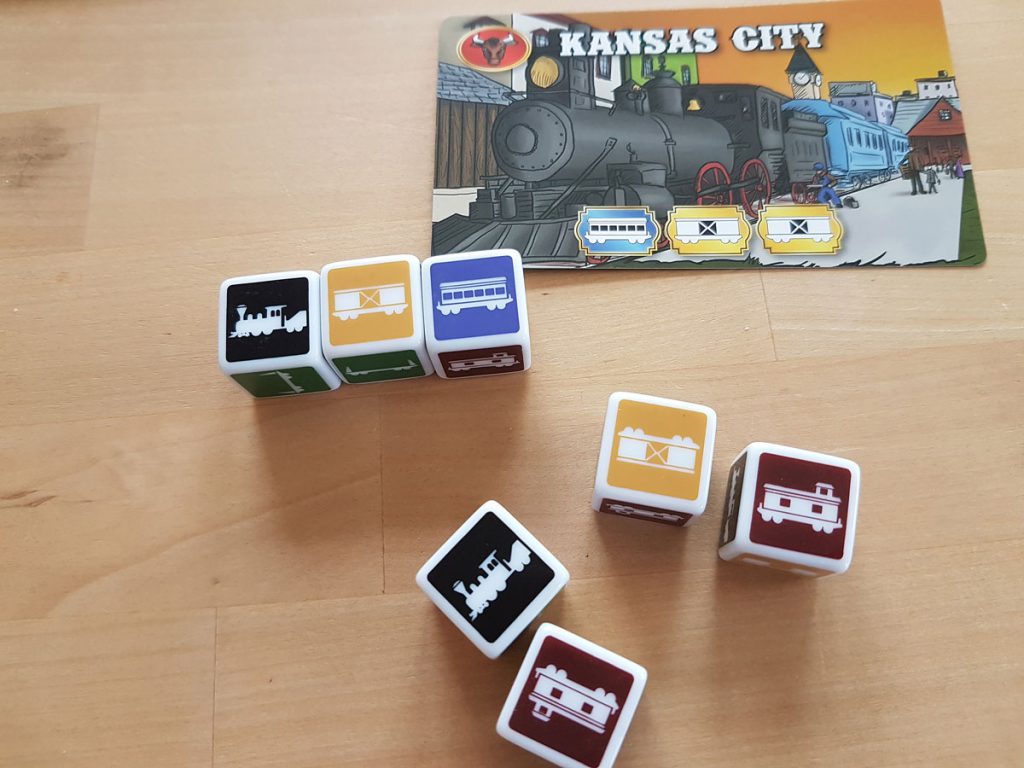 Unsere erste Aufgabe ist es, einen Zug zu beginnen. Dazu müssen wir eine Lokomotive und einen Waggon auswählen. Haben wir keine Lokomotive gewürfelt, erhalten wir einen Marker, der uns später im Spiel helfen kann. Dafür ist aber unser Zug schon beendet. Natürlich können wir unseren Zug um weitere Waggon-Würfel ergänzen. Die nicht benutzten dürfen wir wieder würfeln, müssen anschließend aber mindestens einen Würfel an den Zug anbauen können. Das können wir solange weiterführen, bis wir entweder keinen Würfel anbauen können (Zug entgleist, keine Punkte) oder alle Würfel verbaut sind. Wir können jederzeit früher aufhören. Wichtig ist nur, dass unser gebauter Zug einen Dienstwaggon am Ende hat. Sollte uns das nicht gelingen → entgleist, keine Punkte.