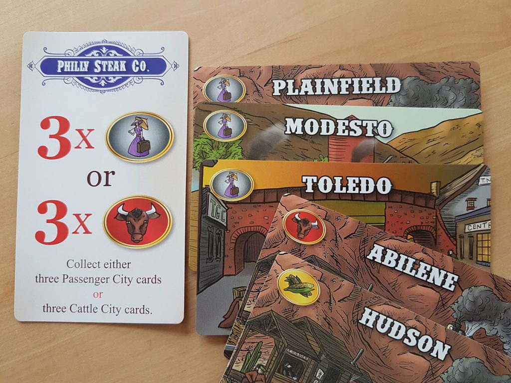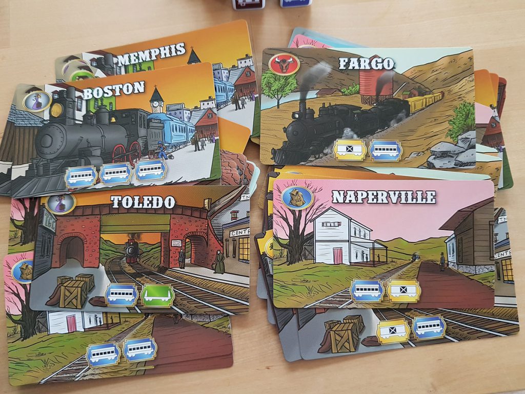 Haben wir einen schönen Zug gebaut und sind nicht entgleist, sollten die Farben der Waggons mit einer der drei Karten übereinstimmen, denn nur dann können wir diese Karte an uns nehmen. Also der schönste Zug nutzt nichts, wenn nicht auch eine entsprechende Karte ausliegt.