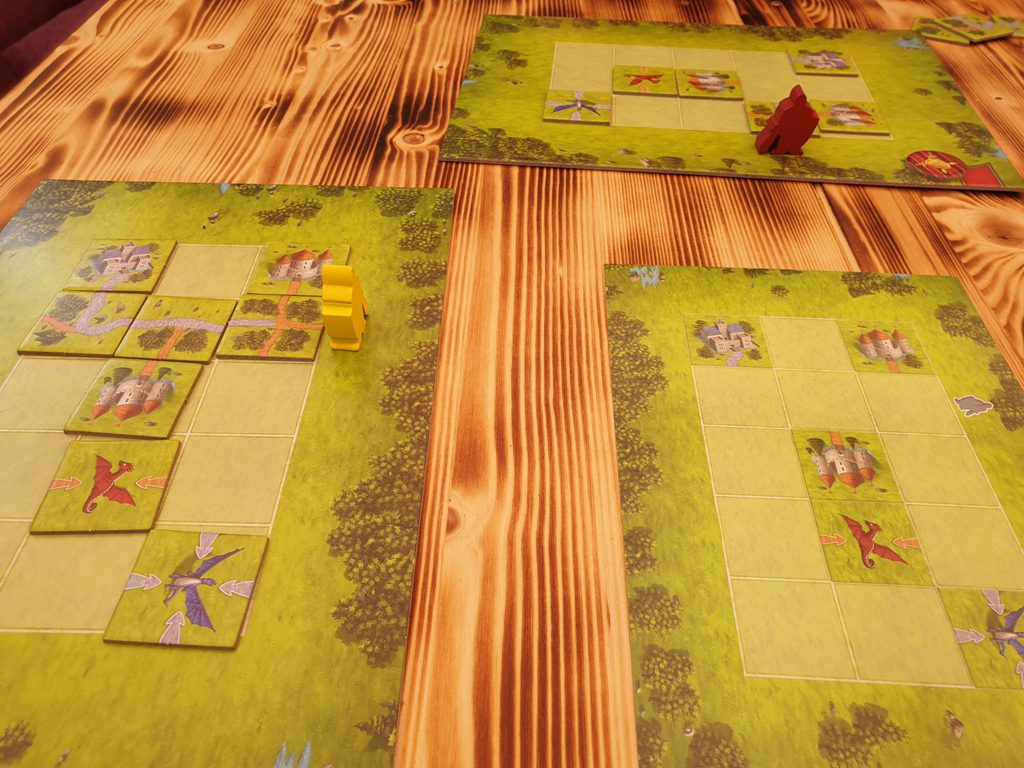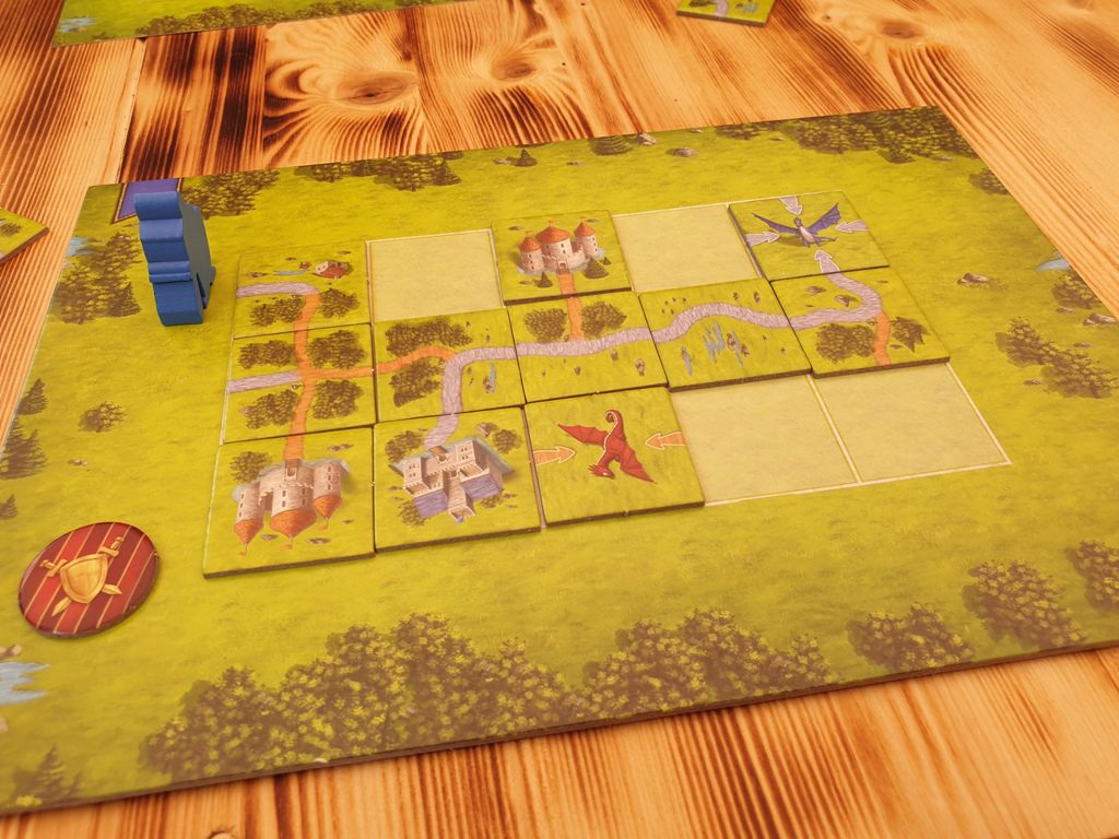 Jeder Spieler erhält ein eigenes Tableau sowie zur Farbe passende Landschaftsplättchen und eine Heldenfigur. Zeitgleich versuchen die SpielerInnen nun die zuvor aufgedeckte Aufgabenkarte auf ihrem Tableau zu lösen. Die Aufgabe gibt an, an welchen Positionen des Tableaus Burgen, Drachen und die Heldenfigur aufgestellt werden müssen. Ziel ist es nun, die Wegeplättchen so auf dem eigenen Heldentableau zu platzieren, dass der Held zu jeder Burg und mit Anstieg der Schwierigkeit auch zu den Drachen gelangen muss.