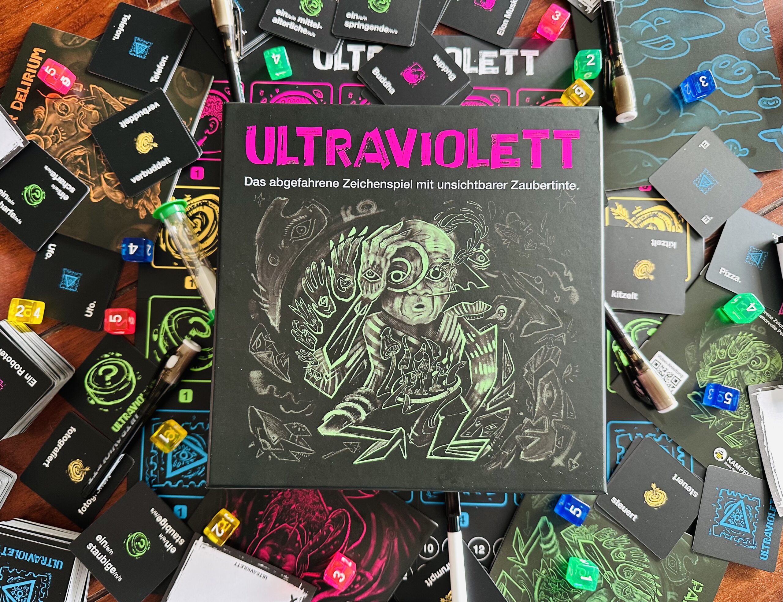 Manchmal gibt es Spiele, bei denen man sich fragt, wer in aller Welt das beim Prototypentest abgenickt hat – und wie viel Kaffee oder Mate-Cola dabei im Spiel war. Ultraviolett gehört genau in diese Kategorie, aber im allerbestbesten Sinne. Denn hier wird gezeichnet – aber nicht normal. Nein. Man malt mit unsichtbarer Tinte. Man malt also blind. Man malt also… im Grunde nach Gefühl. Und zwar ganze Sätze. Satzteile, die zusammen etwas ergeben wie „Ein verliebter Vampir poliert eine eckige Erdbeere.“ Und dann sitzt man da, mit erhobenem UV-Stift, und denkt sich: „Na gut. Dann eben Kunst.“