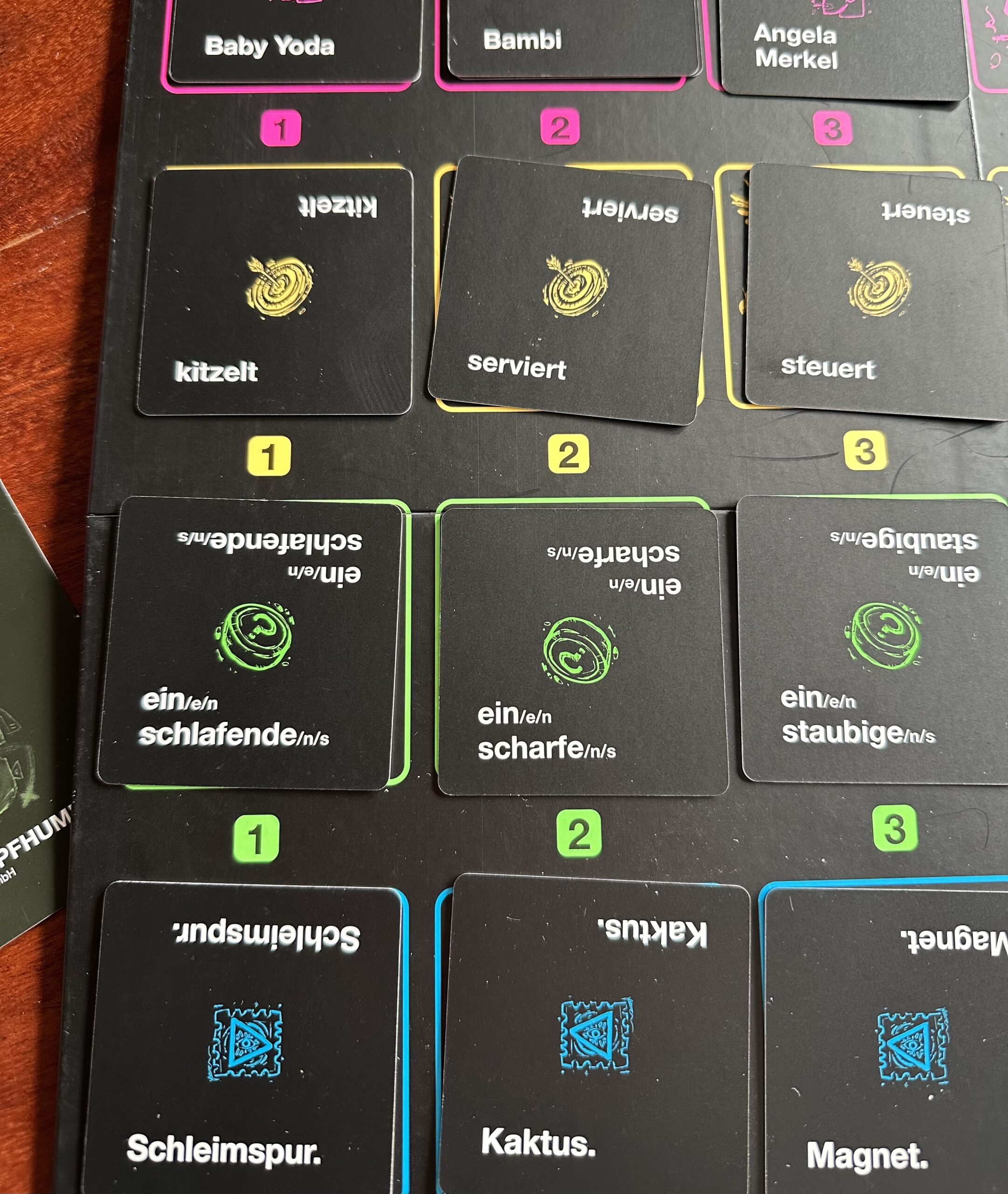 Und hier zeigt sich etwas, das wir wirklich großartig finden: Die Textkarten sind von beiden Seiten bedruckt – das heißt, egal wer wo sitzt, alle sehen alles gleich gut. Keine Verrenkungen, kein Nach-vorne-Beugen. Dazu kommt: Das Material ist stabil und hochwertig – nichts knickt, nichts franst, es fühlt sich wertig an und hält auch mehrere Kunstkatastrophen aus.