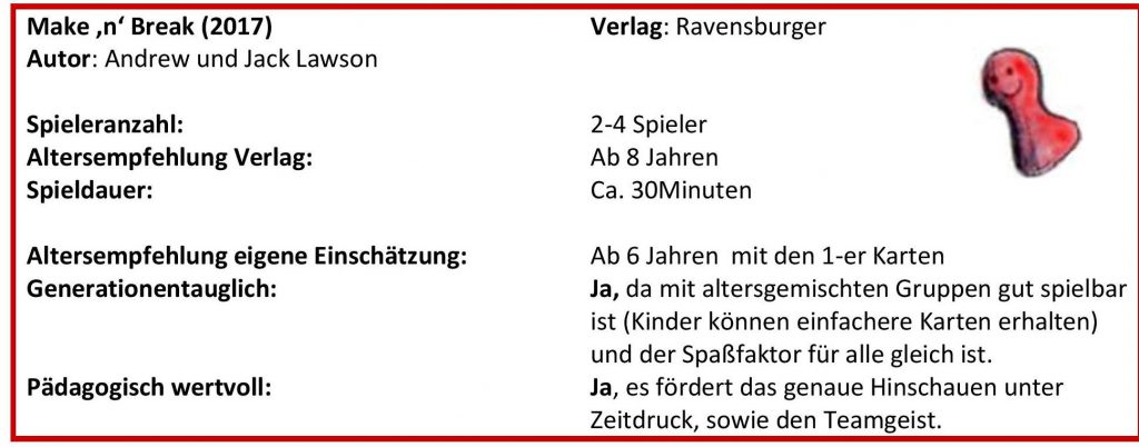 Bei Make ‚n‘ Break handelt es sich um eine Neuauflage des bekannten Spieles von den Autoren Andrew und Jack Lawson und ist bei Ravensburger erschienen. Das Spiel ist laut Verlag ab 8 Jahren geeignet und kann mit 2 bis 4 Spielern gespielt werden.