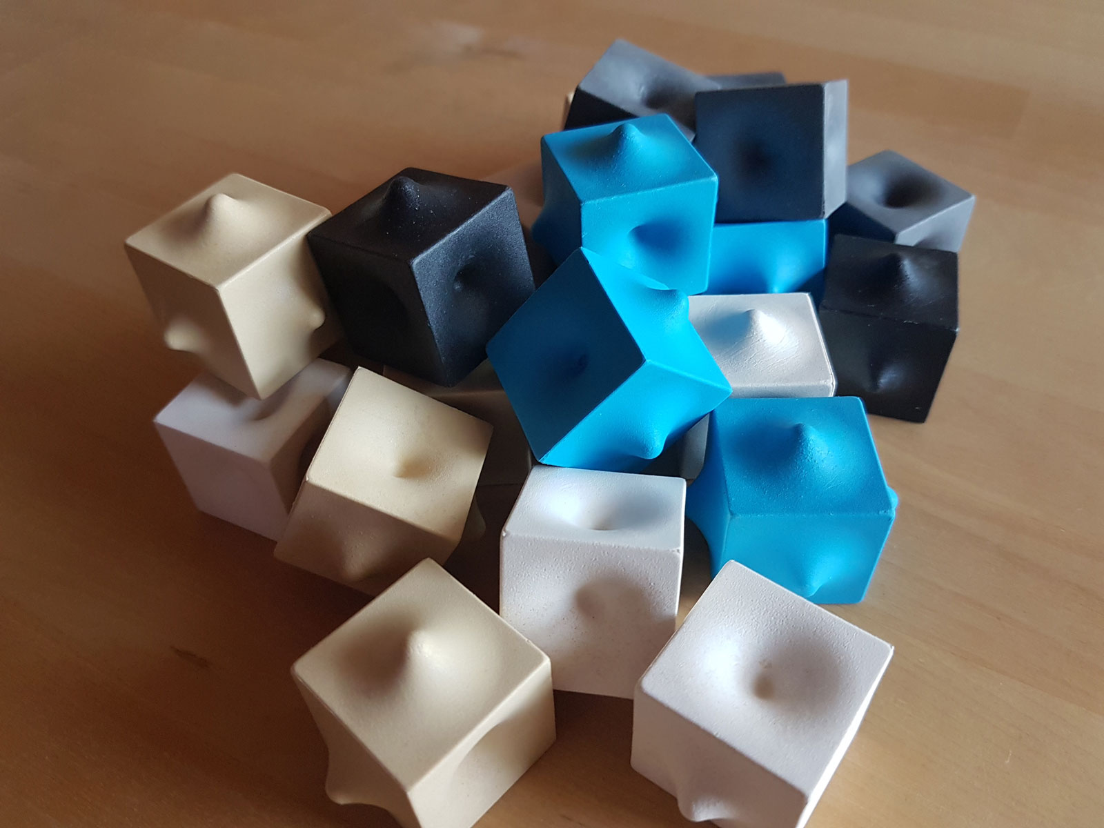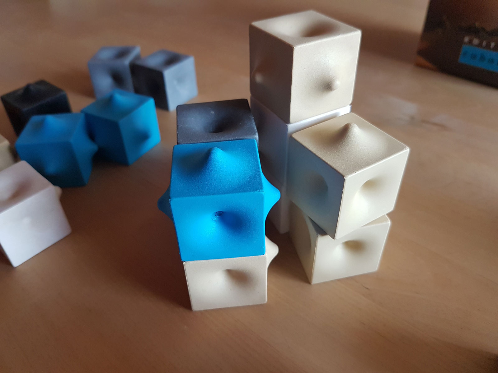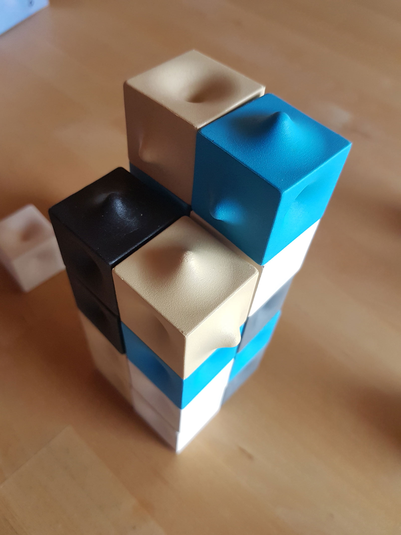Die Möglichkeiten, die man mit den Würfeln hat, sind vielfältig und durch die Außenseiten des Turms, die sowohl Nasen als auch Vertiefungen haben dürfen, ist das Spiel nicht komplett planbar. Erfahrung hilft einem, mit der Zeit zu erkennen, mit welchen Würfeln man am Spielende immer besser dasteht und welche Würfel man schnell loswerden sollte. So hat der erfahrene Spieler gegen den Anfänger leichte Vorteile, aber schon nach zwei, drei Partien ist man selbst ein erfahrener Spieler.