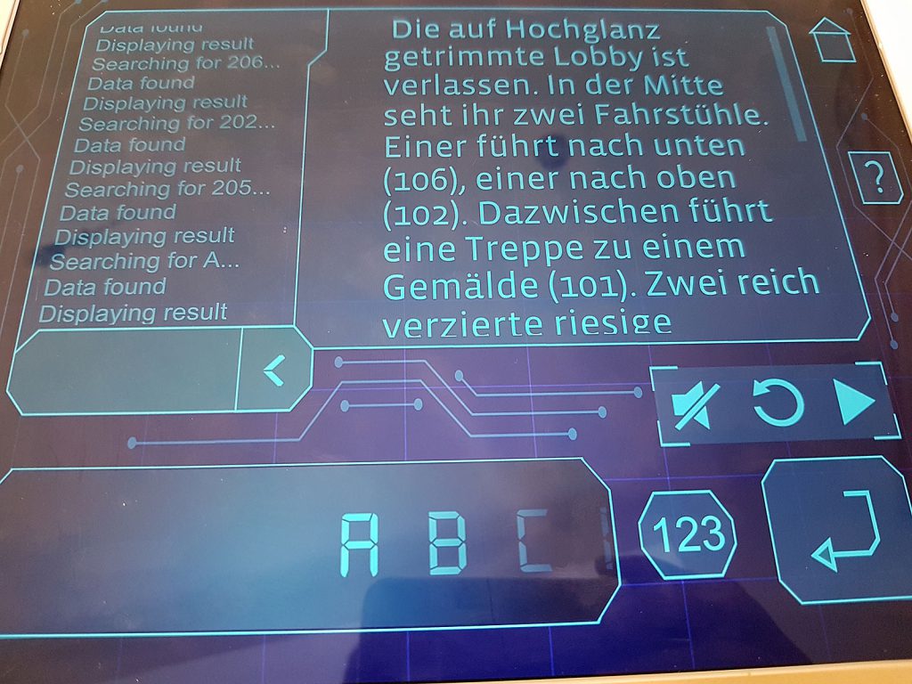 Da es sehr viel Text ist, der ständig vorgelesen werden muss, empfiehlt sich die Verwendung der App. Und – Glückwunsch – die ist wirklich gelungen. Einfach die entsprechende Nummer eingetippt und eine angenehme Stimme liest die entsprechenden Textpassage vor, die man sonst in einem dicken Büchlein nachblättern müsste.