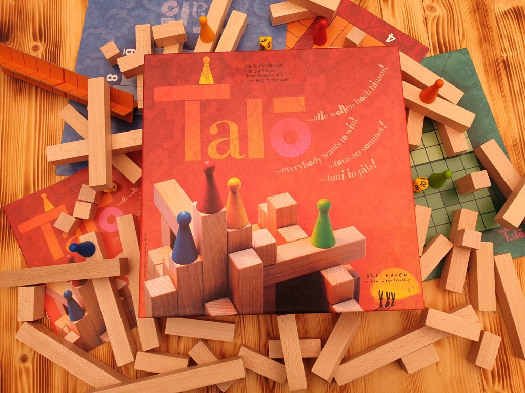 Talo ist ein Spiel von Uta Krüger, Bernd Poloczek und Jens-Peter Schliemann, das 2014 bei Drei Hasen in der Abendsonne erschienen ist. Es kann mit 2 bis 4 SpielerInnen gespielt werden und ist ab 6 Jahren geeignet. Talo wurde entwickelt, um Kindern das Rechnen im Zahlenraum bis 10 Nahe zu bringen. Ganz gelungen ist dies nicht, denn unserer Meinung nach ist Talo mitnichten ein Kinderspiel. Es vermag tatsächlich jedes Alter zu begeistern.