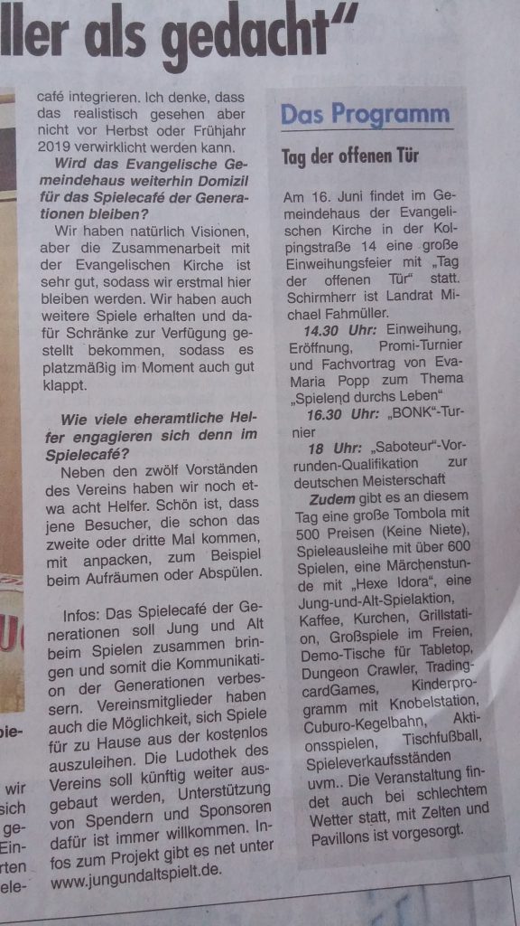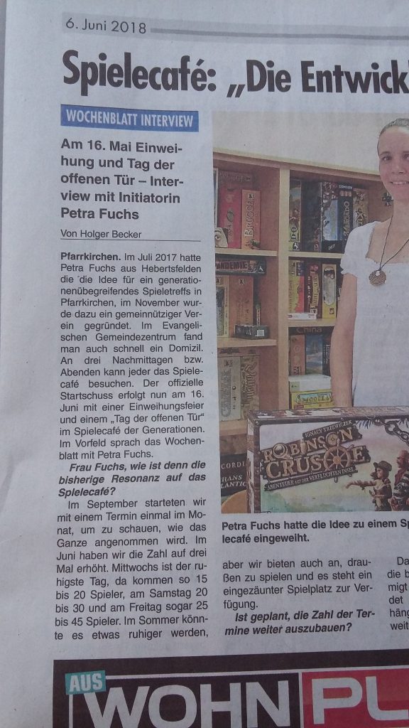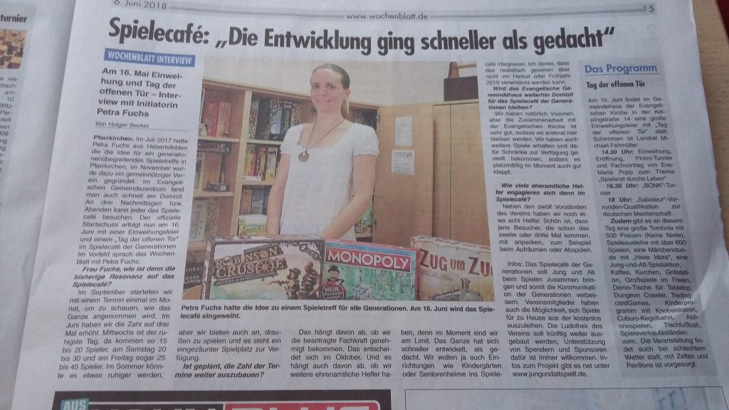 Und heute gleich die nächste Überraschung: Das Spielecafé hat es mal wieder auf die Titelseite vom Wochenblatt geschafft. Wir freuen uns riesig über diesen tollen Artikel und die Ankündigung unserer Einweihungsfeier.