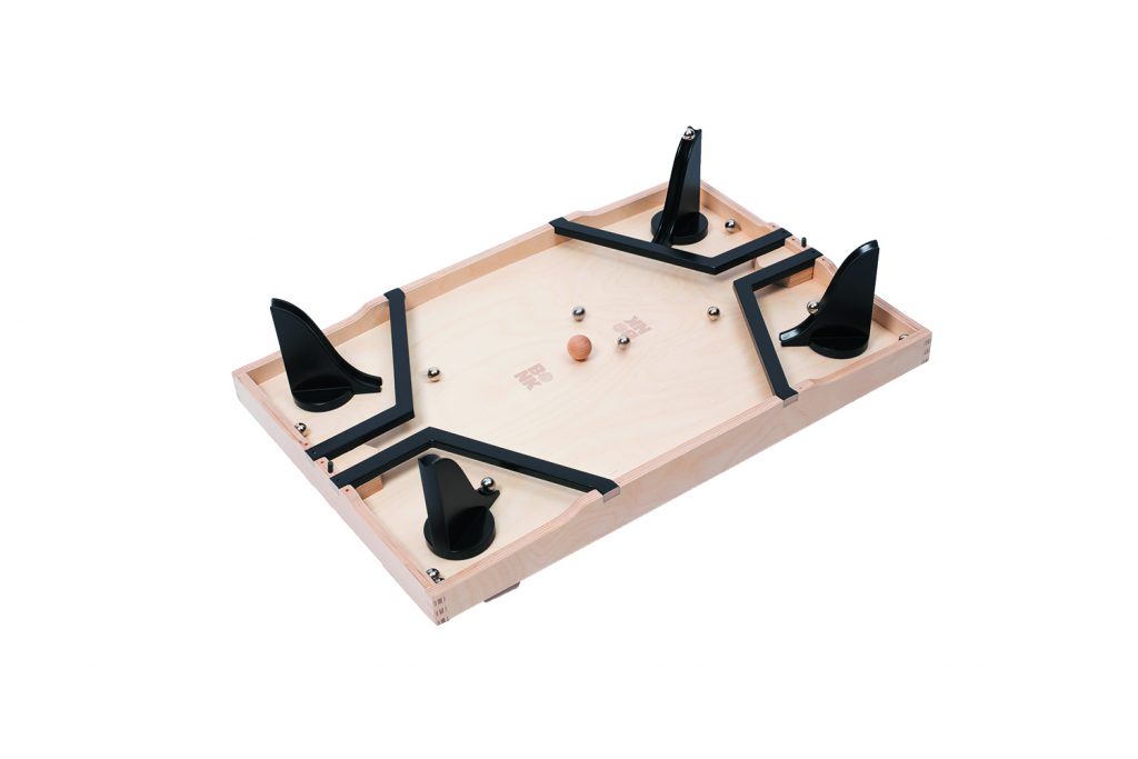 Es spielen zwei 2-er-Teams gegeneinander – und zwar immer gleichzeitig. Das Ziel des Spiels: die eigenen Stahlkugeln so die Rutschen hinunterrollen lassen, dass sie die Holzkugel ins Tor der Gegner befördern. Und wie beim Fußball müssen gegnerische Angriffe auch abgewehrt werden. Gespielt wird immer gleichzeitig, aber jeder Spieler kontrolliert seine eigene Rutsche.