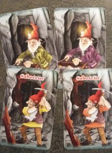 „Als Goldsucher begeben sich die Spieler im Bergwerk auf die Jagd nach dem wertvollen Metall. Plötzlich zerbricht eine Spitzhacke und das Grubenlicht erlischt. Ein Saboteur hat zugeschlagen. Doch wer treibt in dem Stollen sein Unwesen? Werden die Goldsucher erfolgreich sein oder behält der Saboteur mit seinen finsteren Aktionen die Oberhand? Es bleibt spannend bis zum Ende! Nach drei Runden gewinnt der Spieler mit den meisten Goldstücken.“ (Text von Amigo: https://www.amigo-spiele.de/spiel/saboteur)