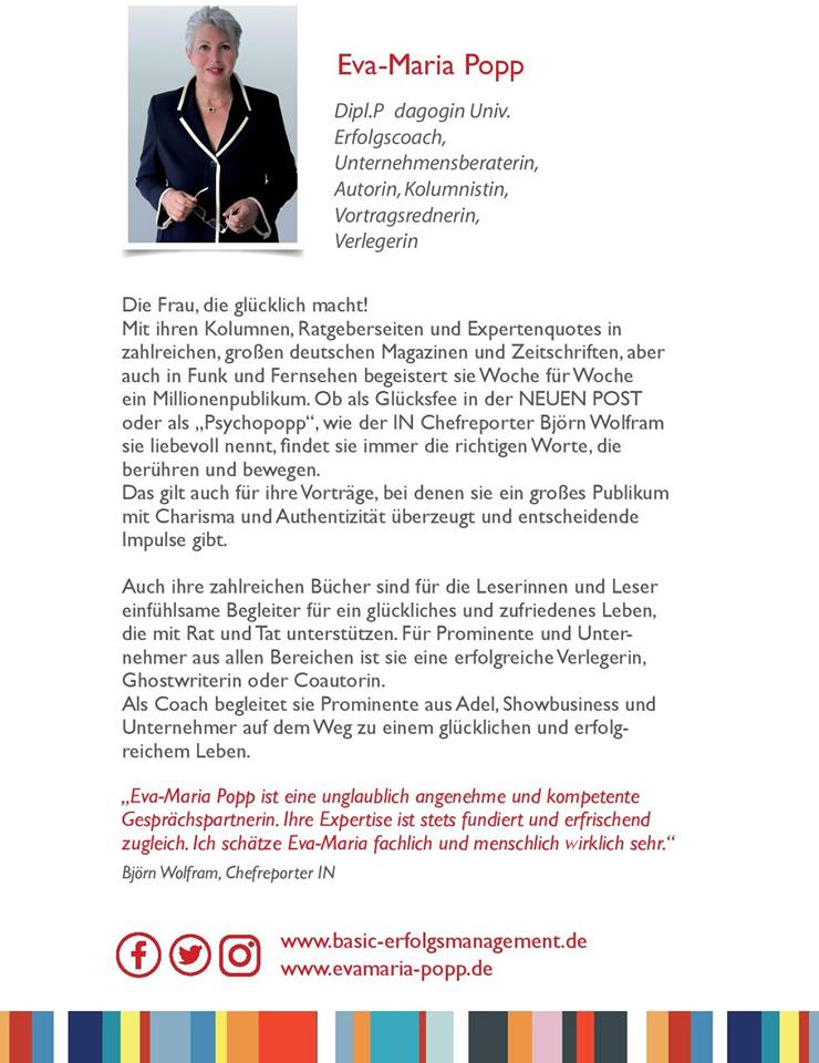 Eva-Maria Popp ist Coach und Unternehmensberaterin für soziale Themen. In ihren Büchern, Kolumnen und Expertenquotes publiziert sie in den Medien unter anderem die Wichtigkeit des Spiels für die einzelnen Menschen aber auch für die ganze Gesellschaft.