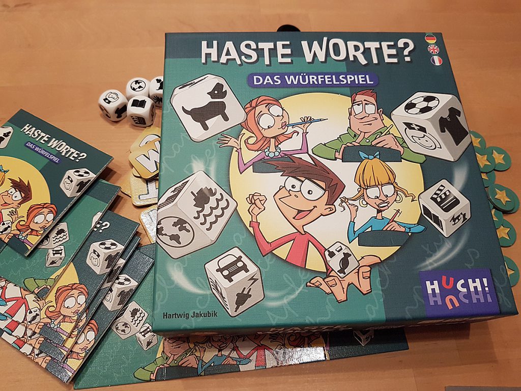 „Haste Worte – das Würfelspiel“ von Hartwig Jakubik für 2 bis 6 Spieler ab 10 Jahren, erschienen bei Huch! 2018, ist eine interessante Variante des bekannten „Stadt-Land-Fluss“-Themas mit immer neuen Themen und mit der Möglichkeit, auch gegen andere Spieler zu spielen. Die richtige passende Gruppe wird daran Spaß haben, weil es eine frische neue Variante ist, alle anderen, besonders gemischte Gruppen, haben eher weniger Freude am Spiel.